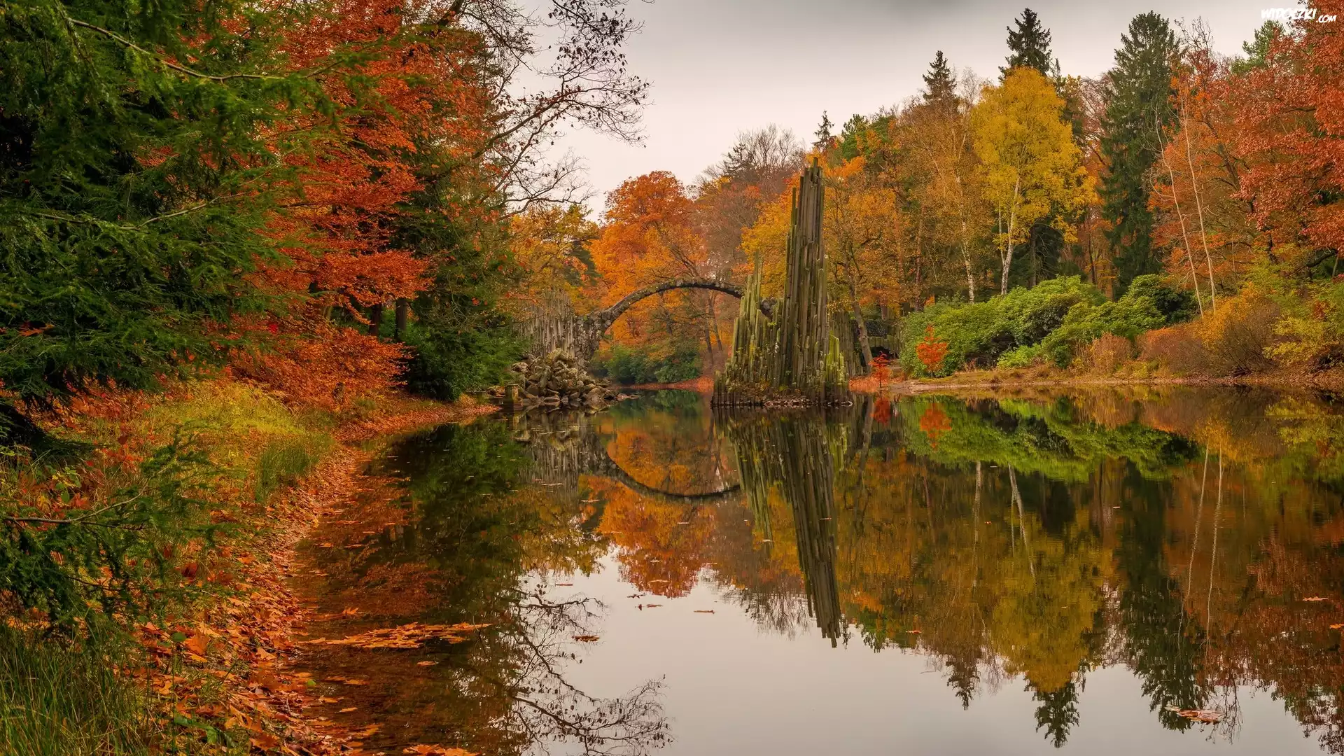 Niemcy, Saksonia, Park Rododendronów Kromlau, Kamienny, Most łukowy, Most Diabła, Jezioro Rakotz, Jesień, Drzewa |