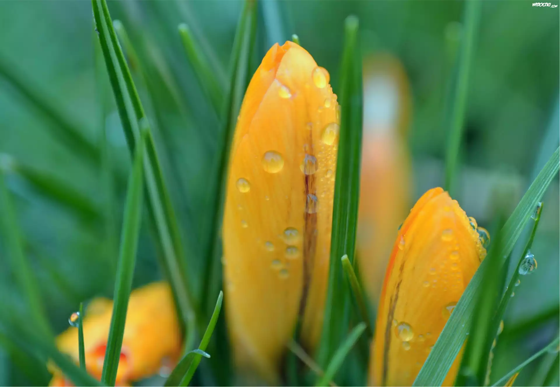 Zdjęcia, Żółte, Krokusy, Wiosna, Krople, Rosy