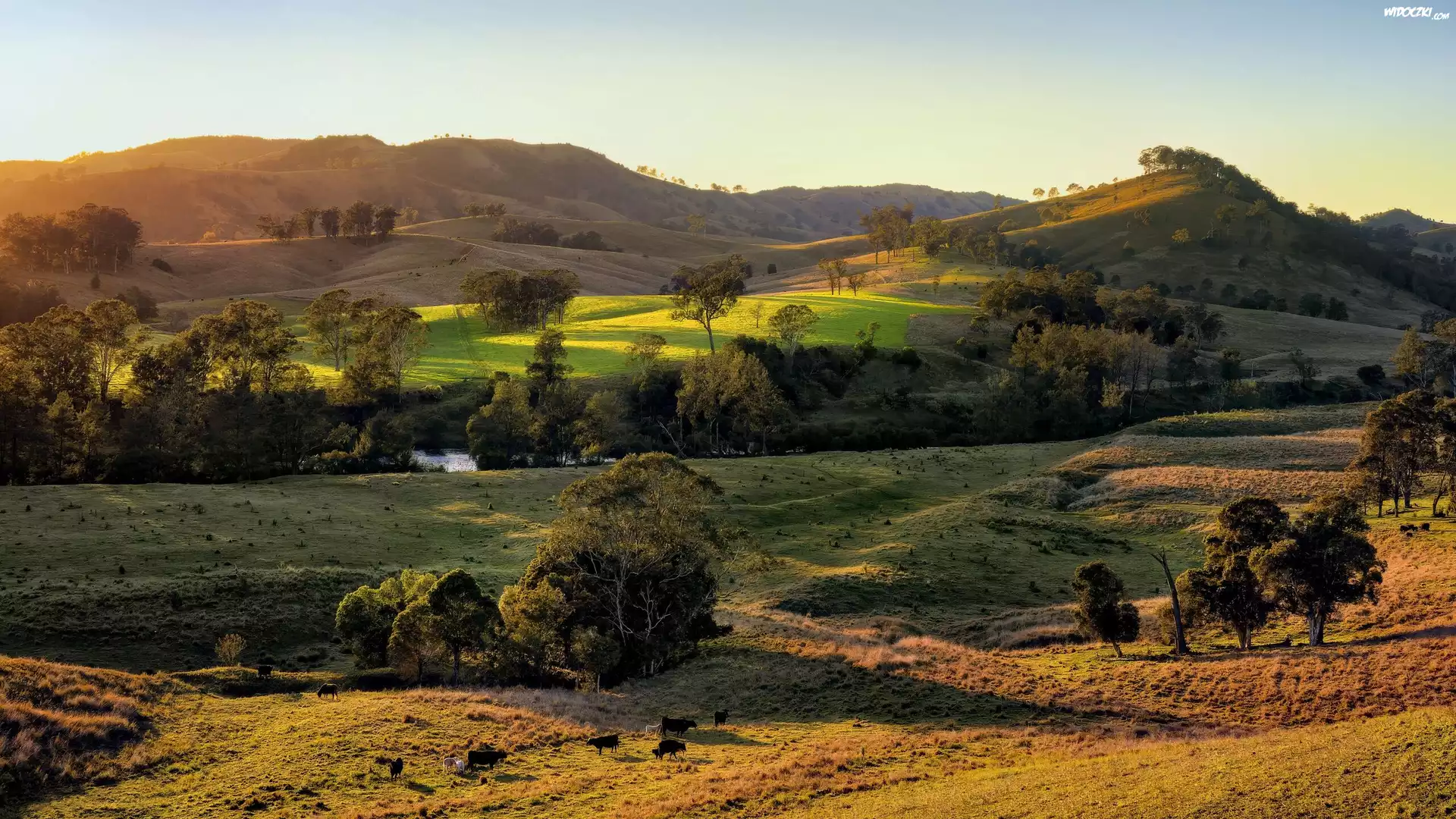 Zdjęcia, Pole, Wzgórza, Drzewa, Krowy