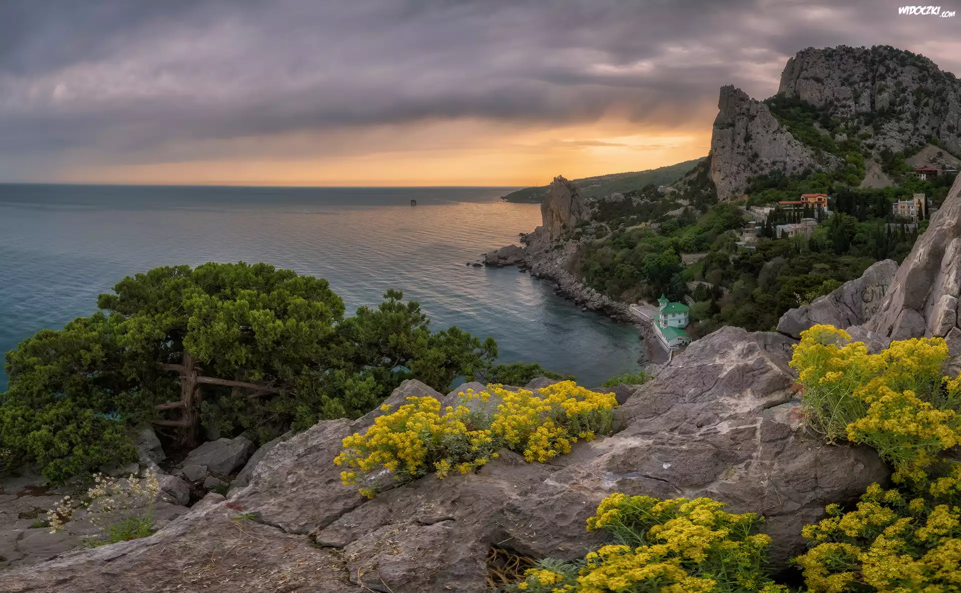 Zdjęcia, Morze, Skały, Niebo, Domy, Drzewa, Góra Koshka, Miejscowość Simejiz, Krym