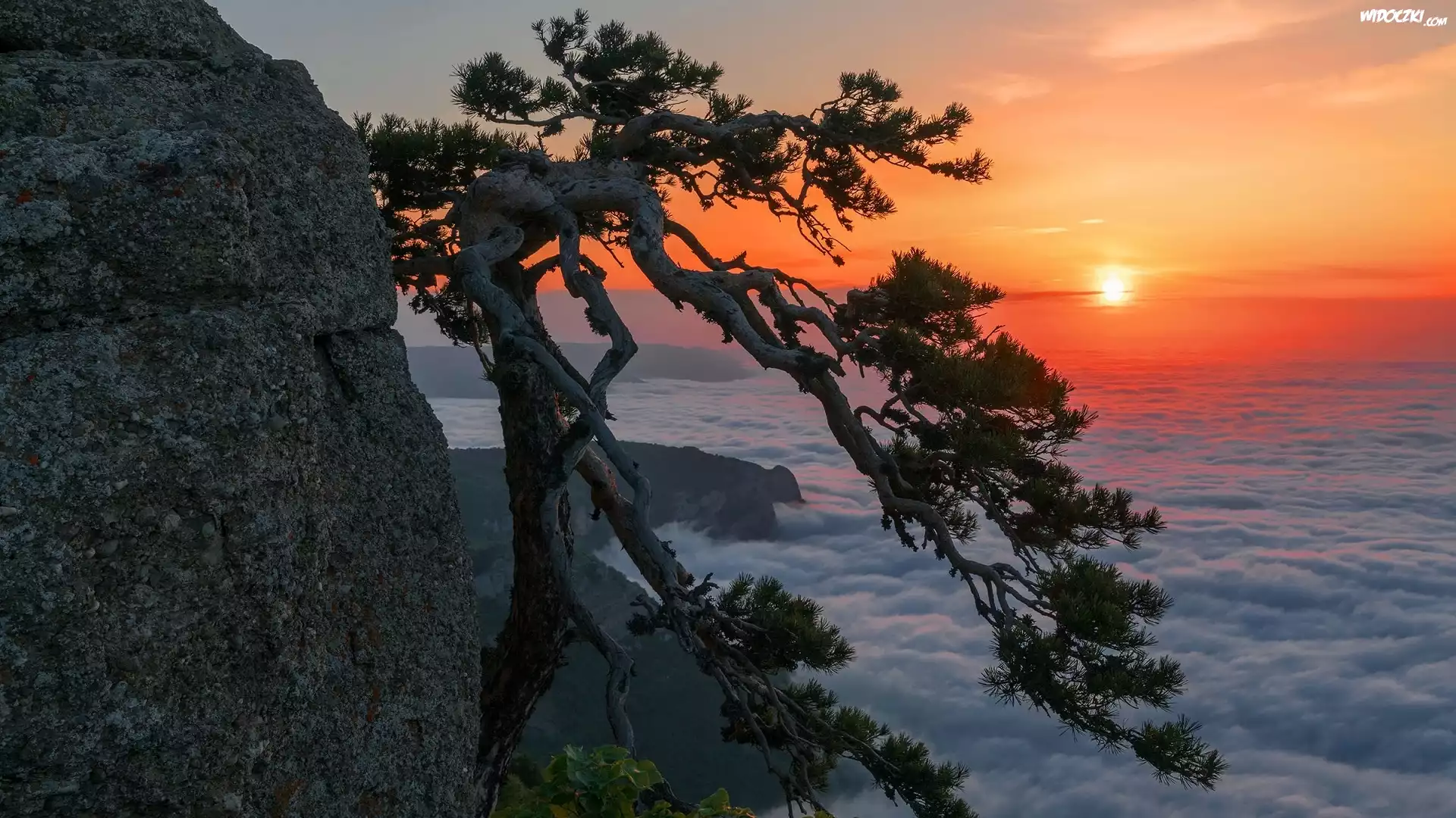 Krym, Miejscowość Ałuszta, Góra Demerdżi, Dolina Duchów, Wschód słońca, Drzewo, Sosna, Chmury, Morze |