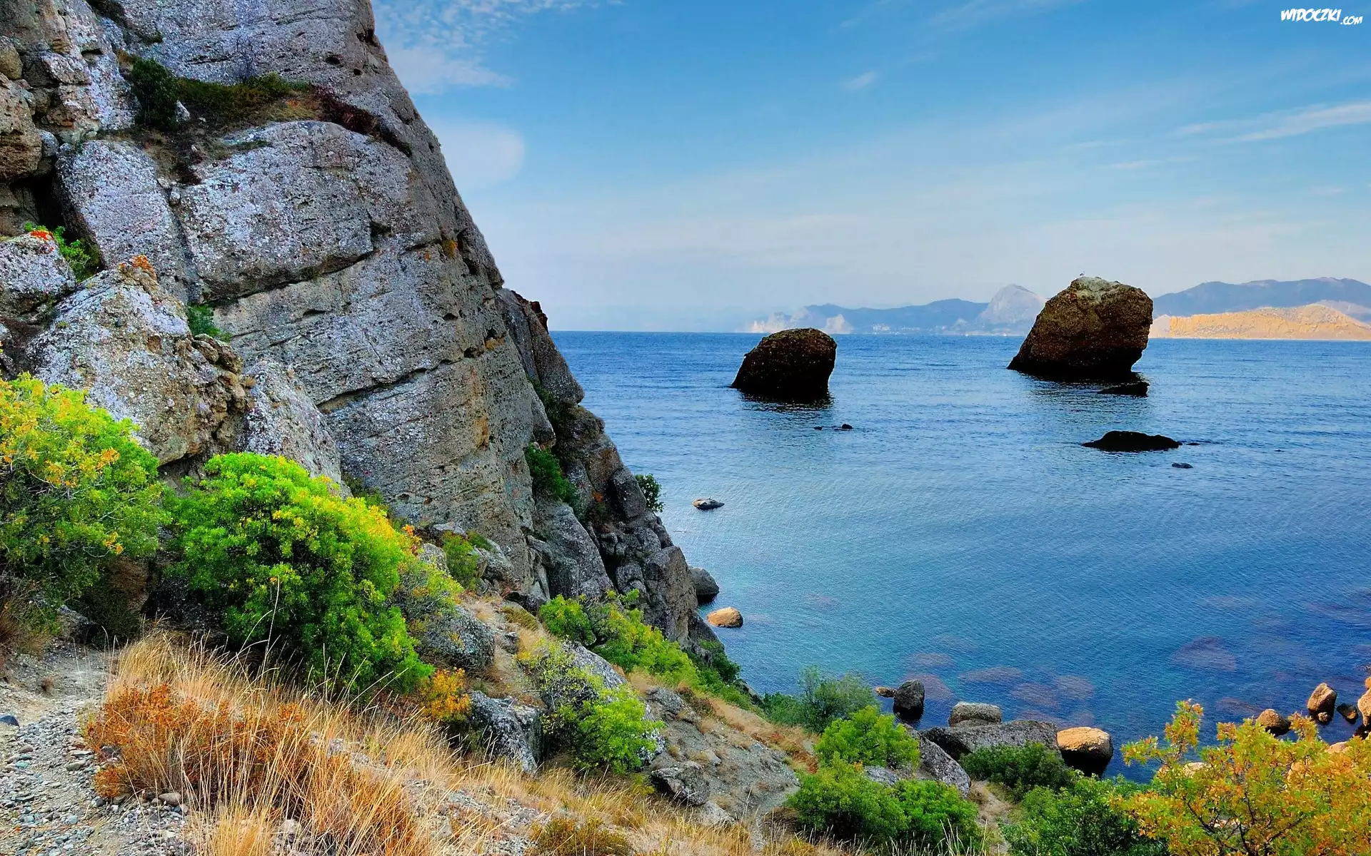 Zdjęcia, Krym, Morze, Plaża, Góry, Skały, Krzewy