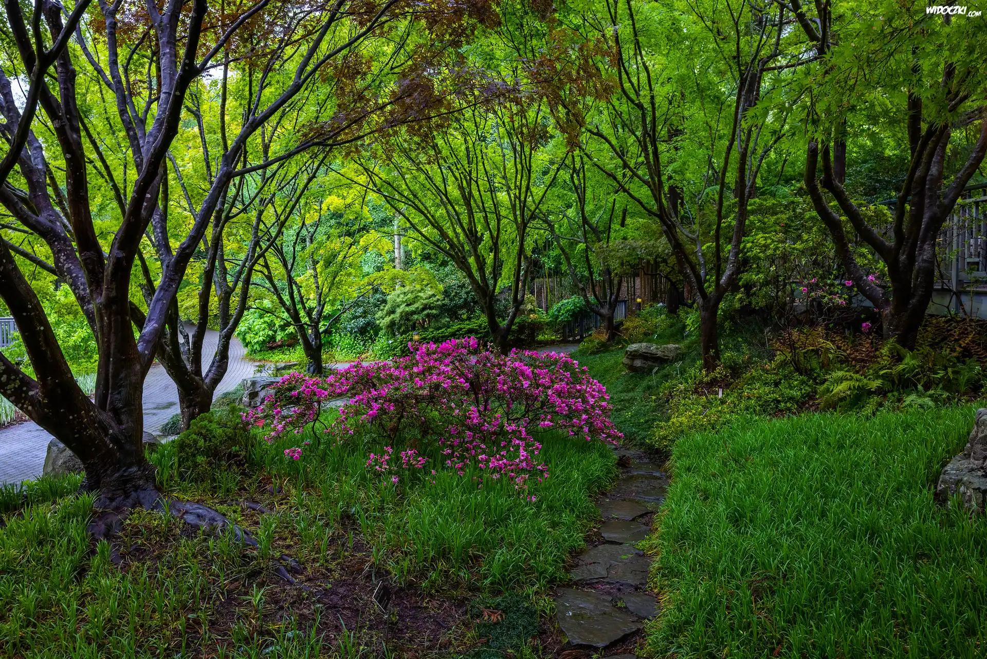 Zdjęcia, Park, Drzewa, Kwitnący, Krzew, Różanecznik, Ścieżka