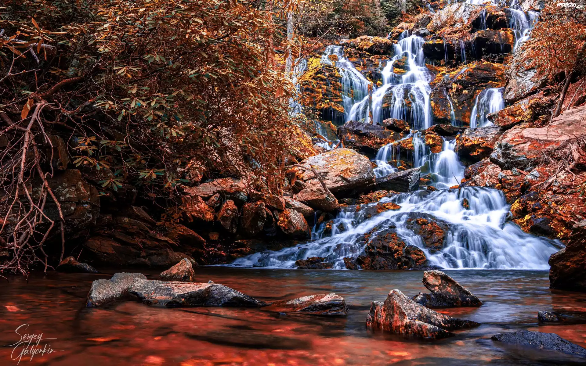 Zdjęcia, Wodospad, Kaskada, Kamienie, Krzew
