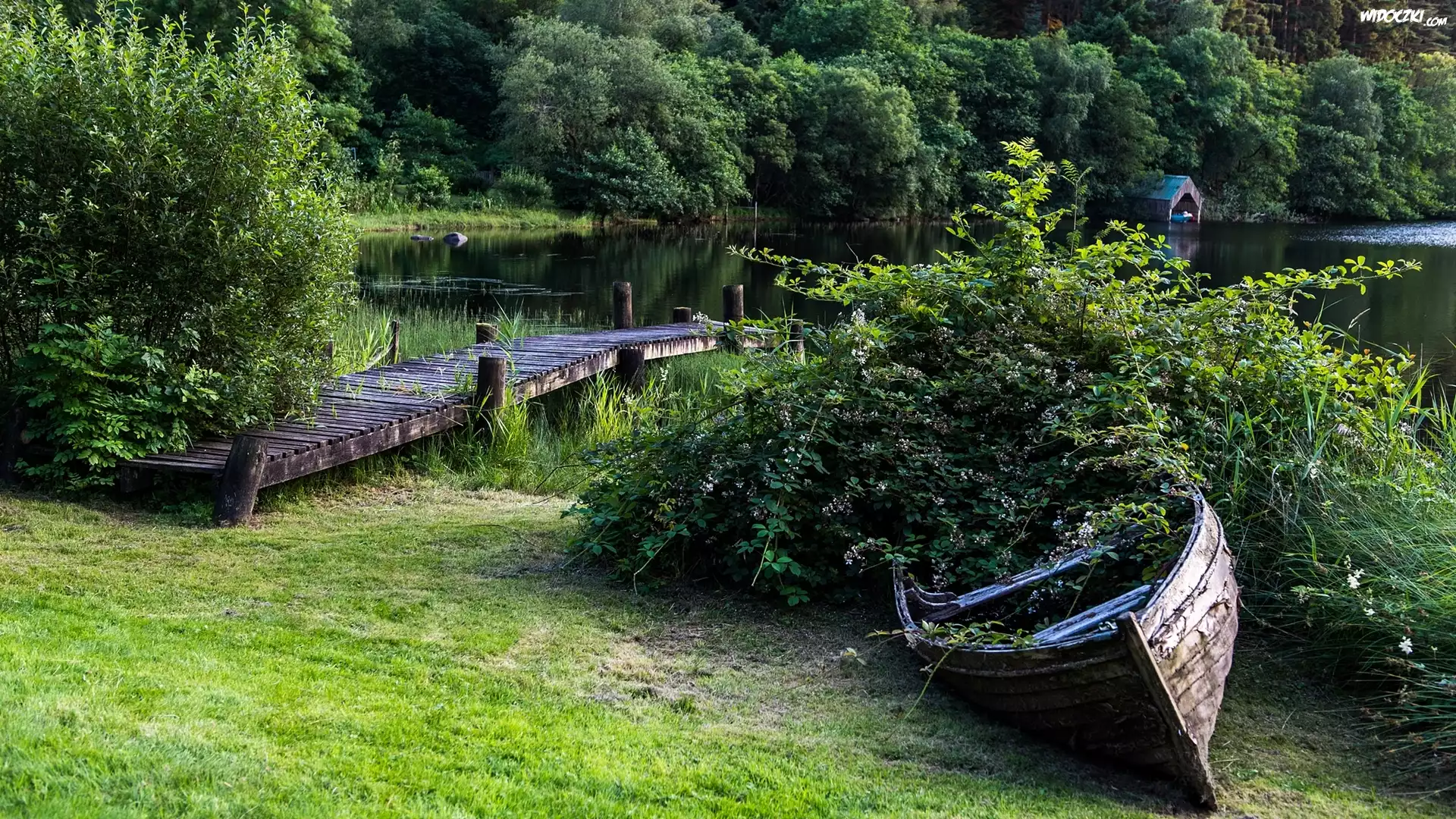 Zdjęcia, Krzewy, Jezioro, Łódka, Drewniany, Pomost