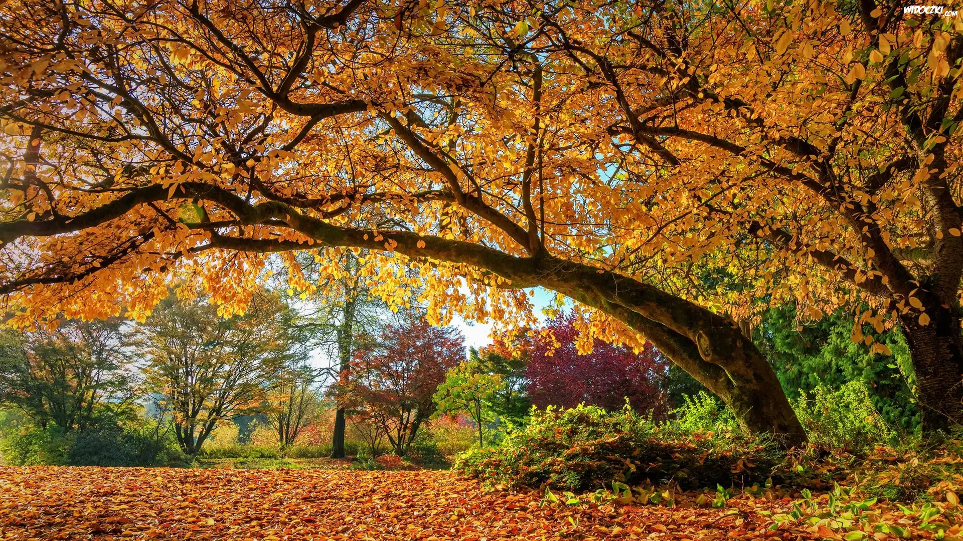 Zdjęcia, Drzewa, Krzewy, Pochylone, Drzewo, Pożółkłe, Liście, Jesień