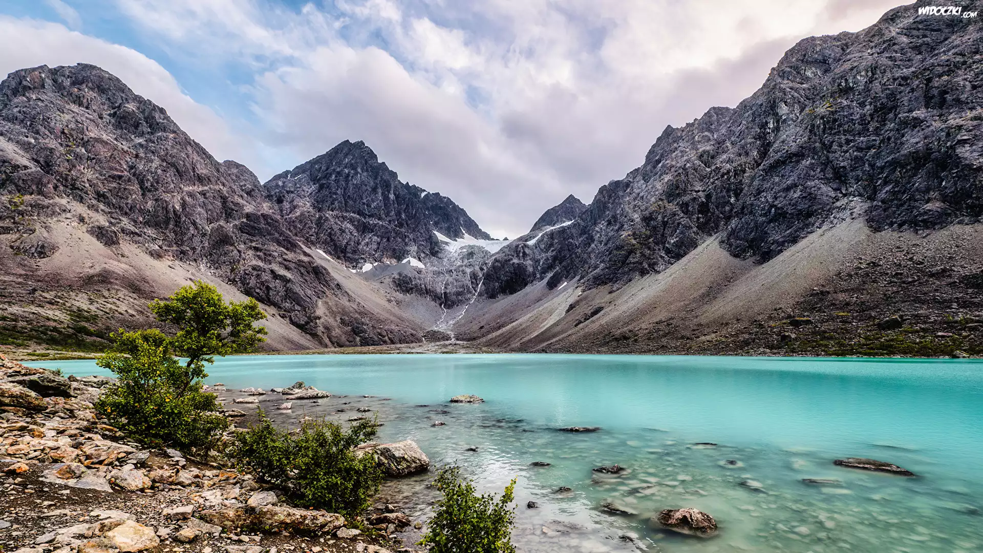 Zdjęcia, Góry, Jezioro, Kamienie, Krzewy, Niebo, Białe, Chmury