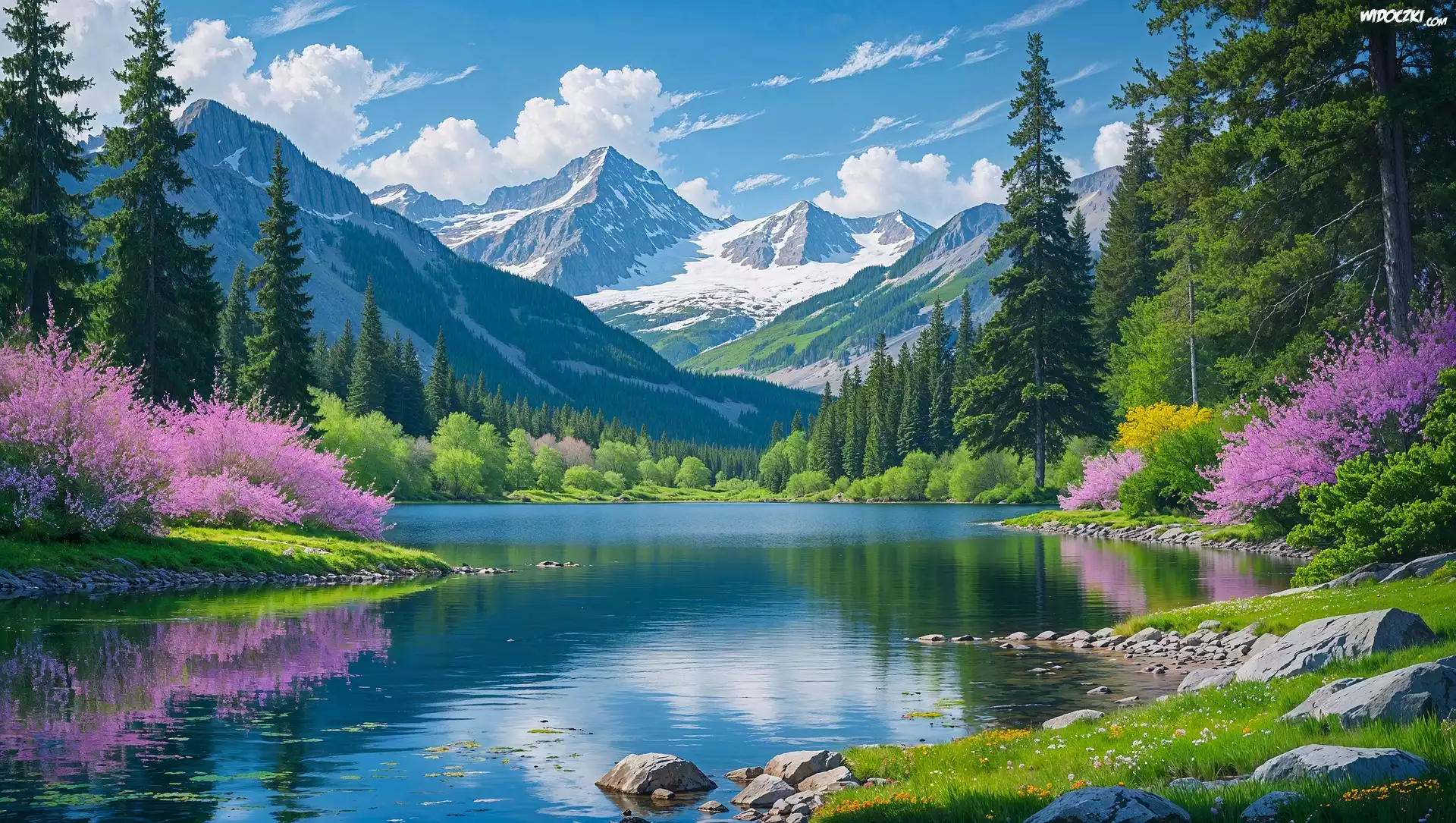 Wiosna, Drzewa, Kwitnące, Krzewy, Jezioro, Góry, Grafika
