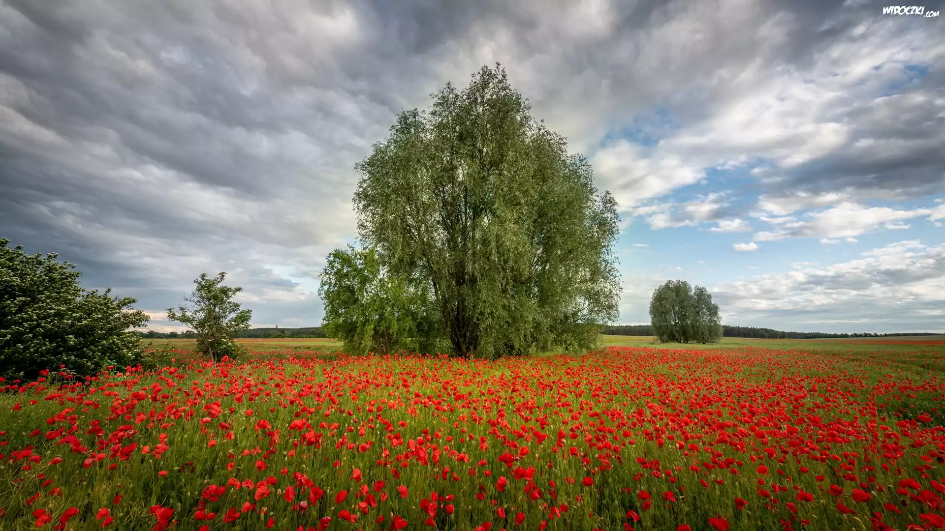 Zdjęcia, Łąka, Maki, Drzewa, Krzewy, Chmury