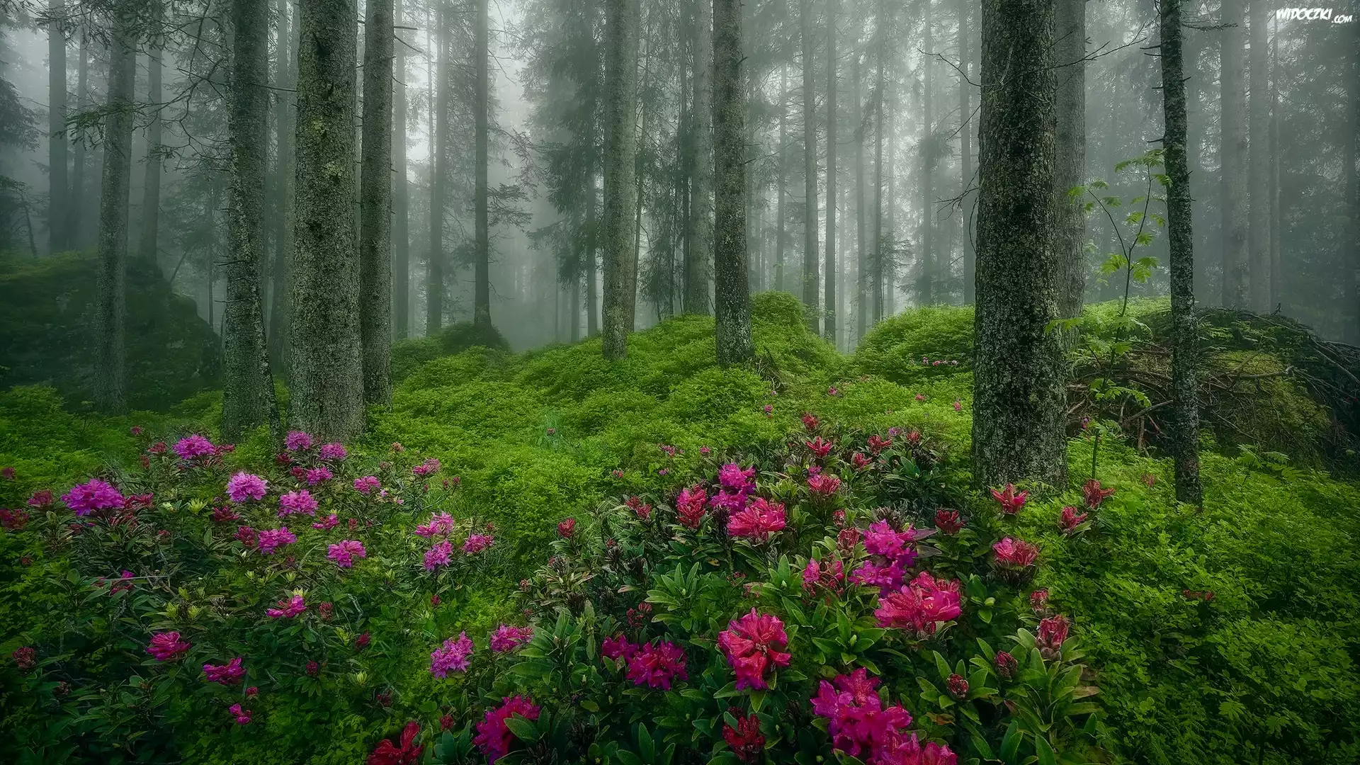 Zdjęcia, Las, Drzewa, Mgła, Krzewy, Kwiaty, Rododendrony, Różanecznik