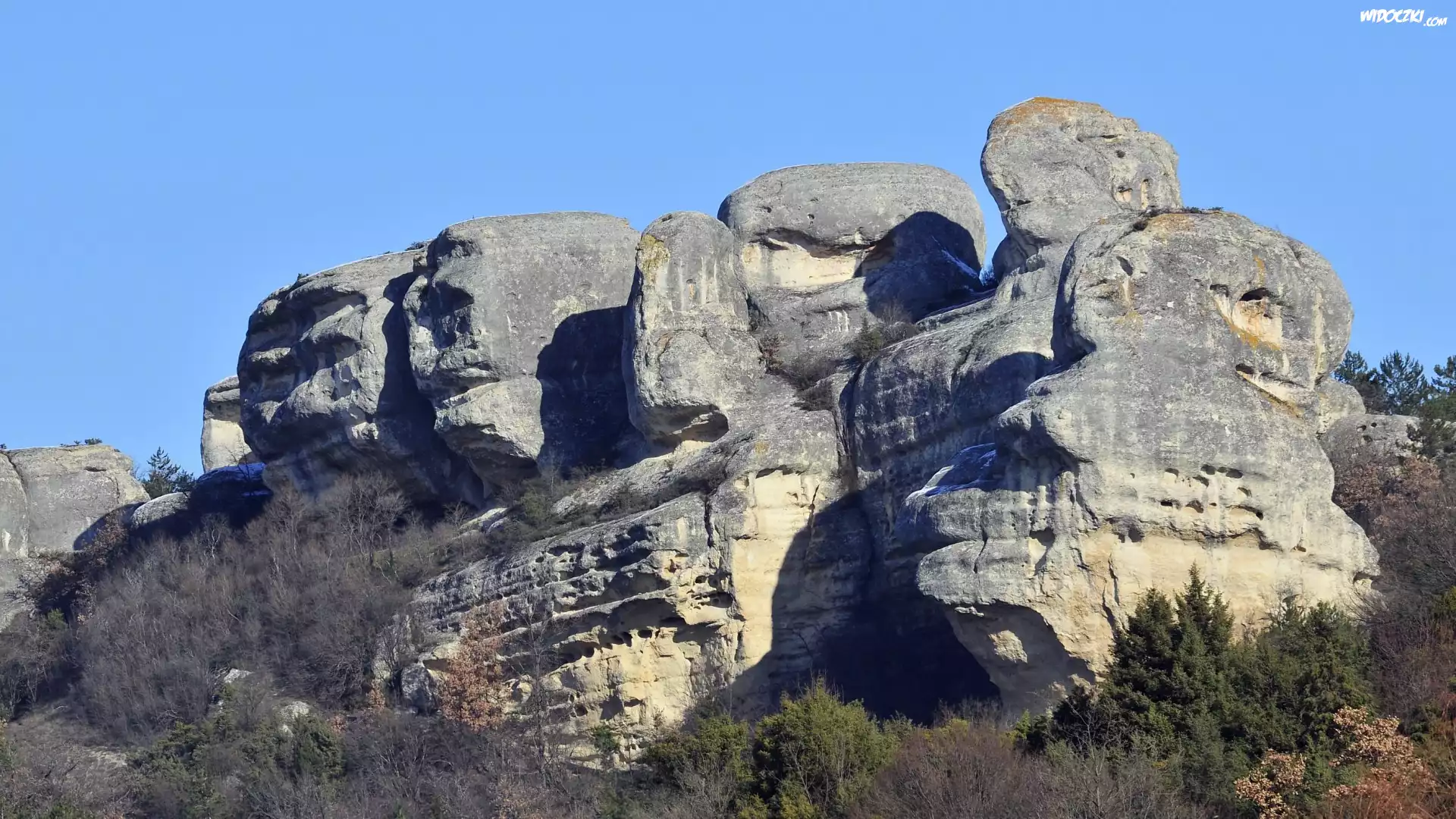 Zdjęcia, Skały, Krzewy, Niebo