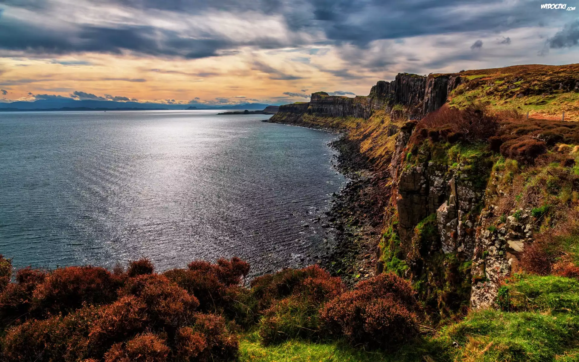 Morze, Wybrzeże, Skały, Krzewy, Roślinność, Chmury, Klify