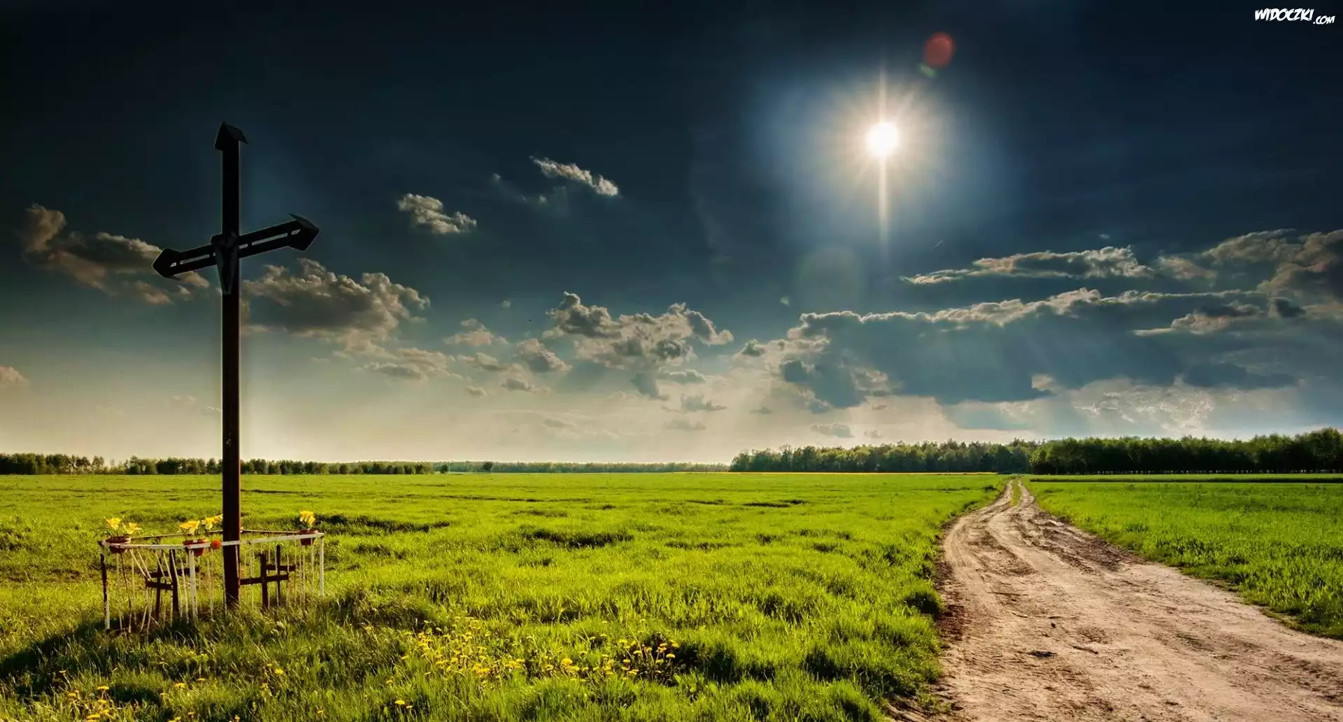 Zdjęcia, Krzyż, Droga, Łąka, Słońce, Niebo