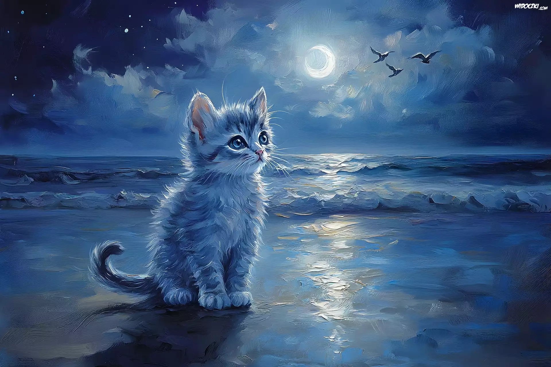 Zdjęcia, Kotek, Mewy, Morze, Księży, Noc, Grafika AI