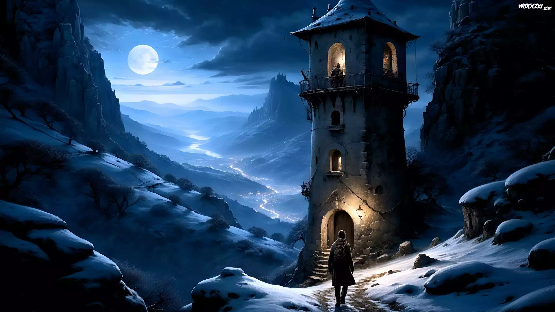 Grafika, Wieża, Człowiek, Księżyc, Noc, Góry, Dolina