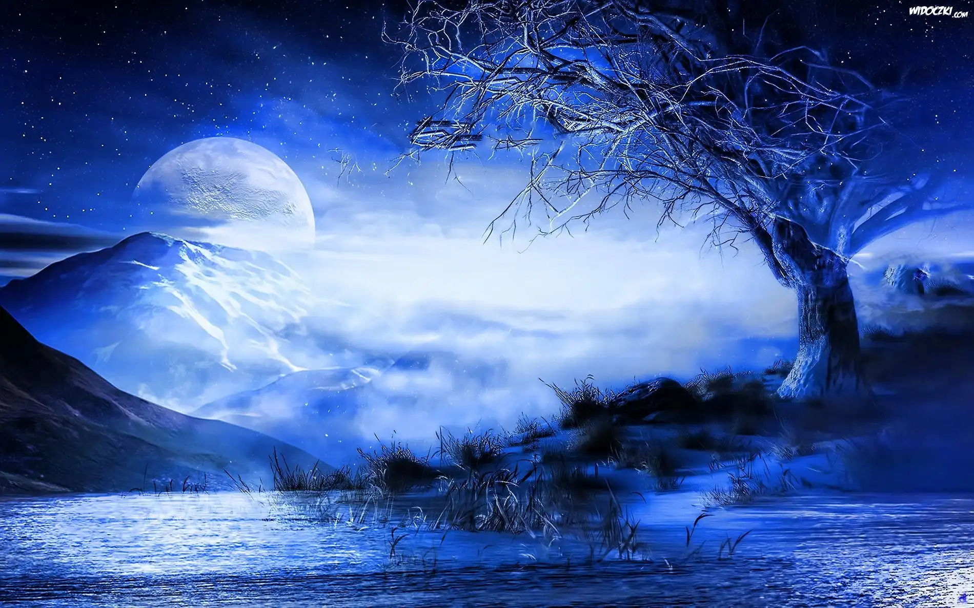 Księżyc, Gwiazdy, Góry, Jezioro, Drzewo, Mgła