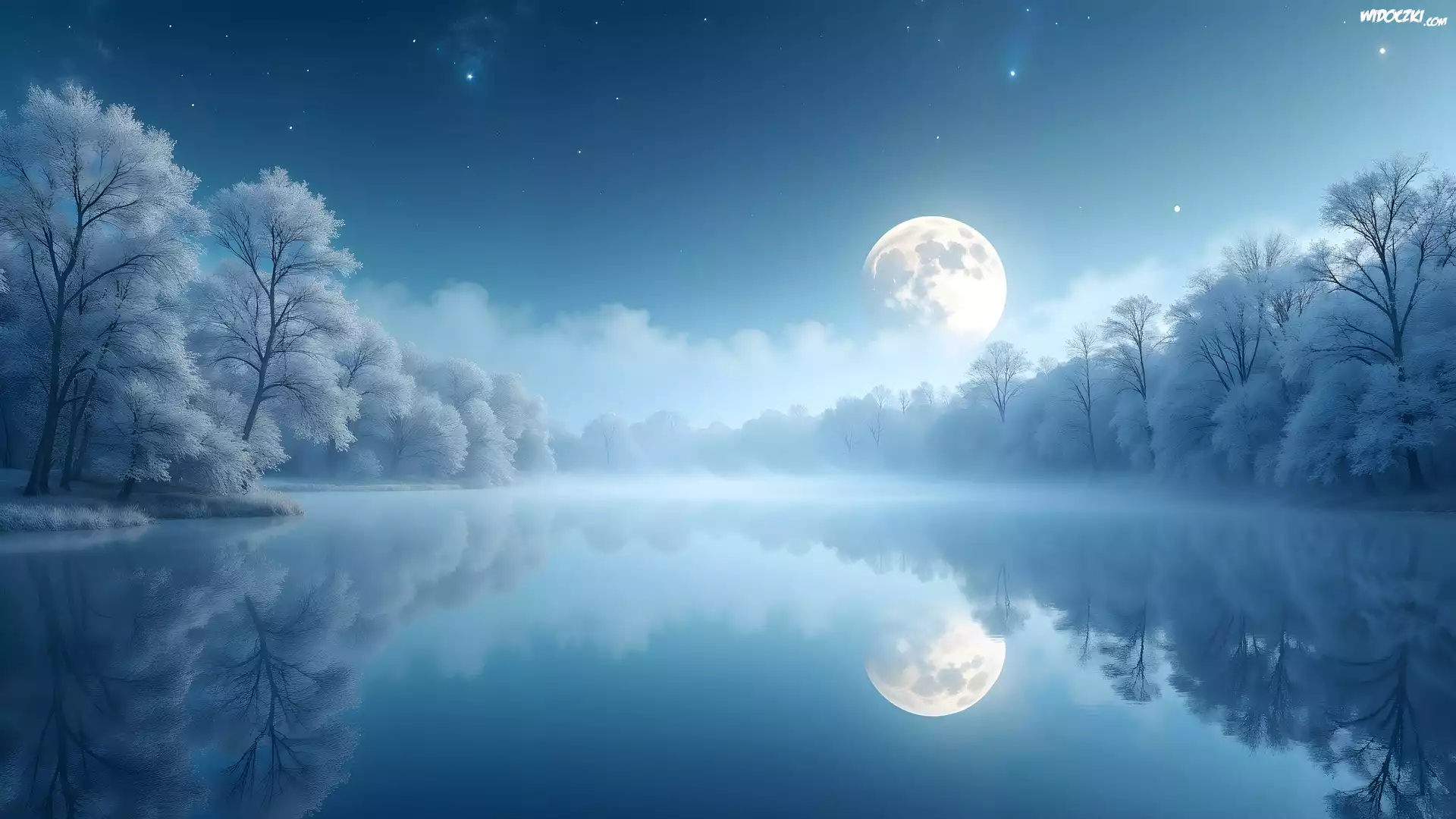 Zdjęcia, Jezioro, Ośnieżone, Drzewa, Księżyc