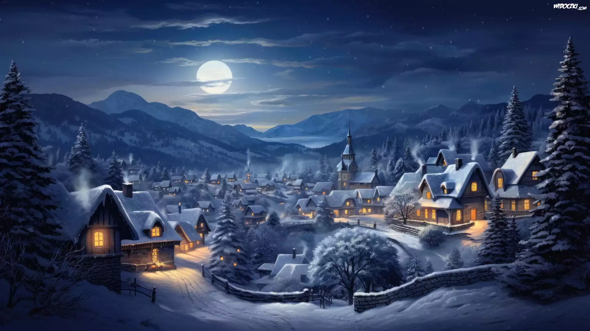 Zdjęcia, Zima, Miasteczko, Noc, Księżyc, Domy, Choinki, Grafika