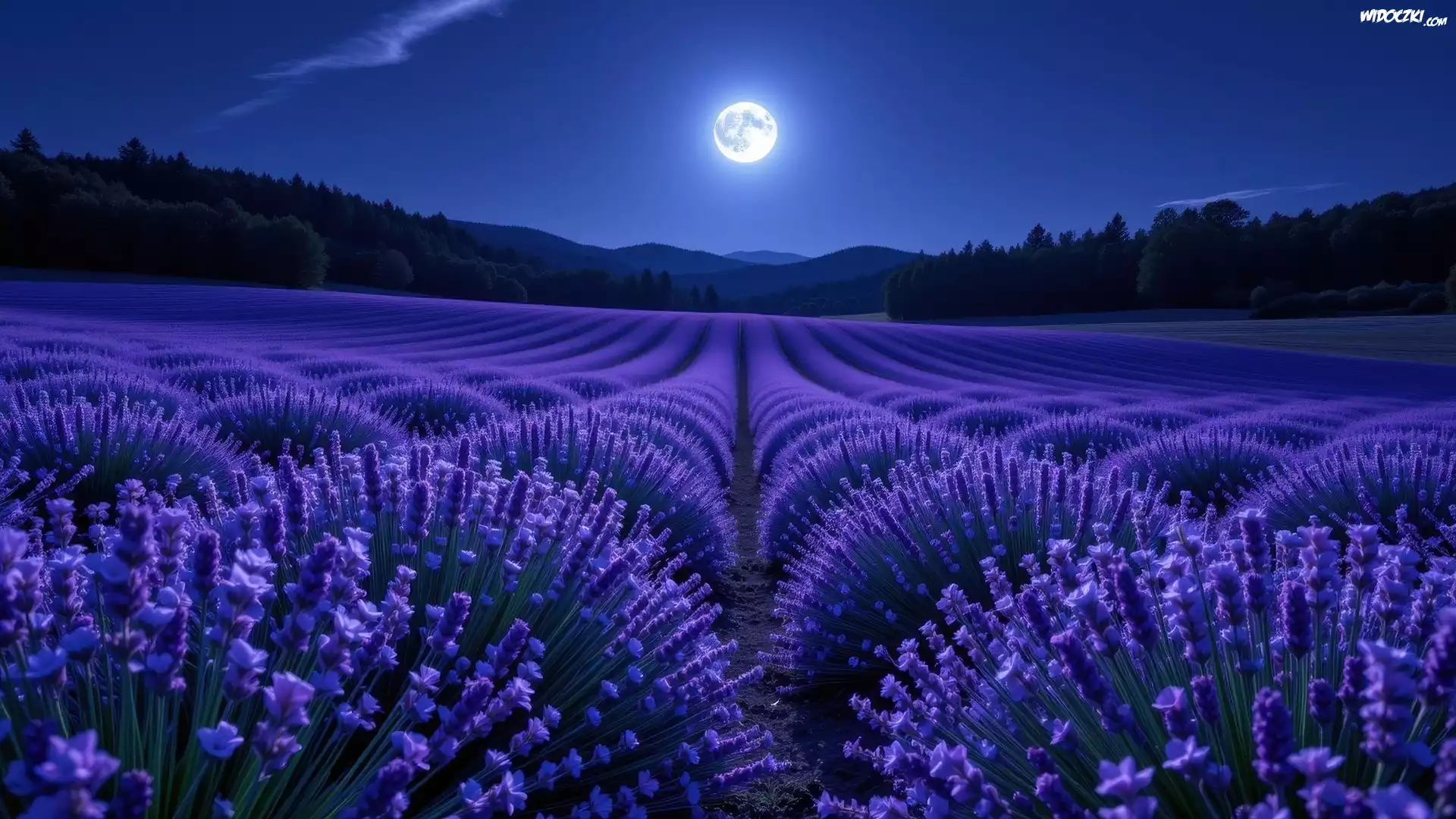 Lawenda, Pole, Noc, Księżyc, Drzewa, Góry, AI