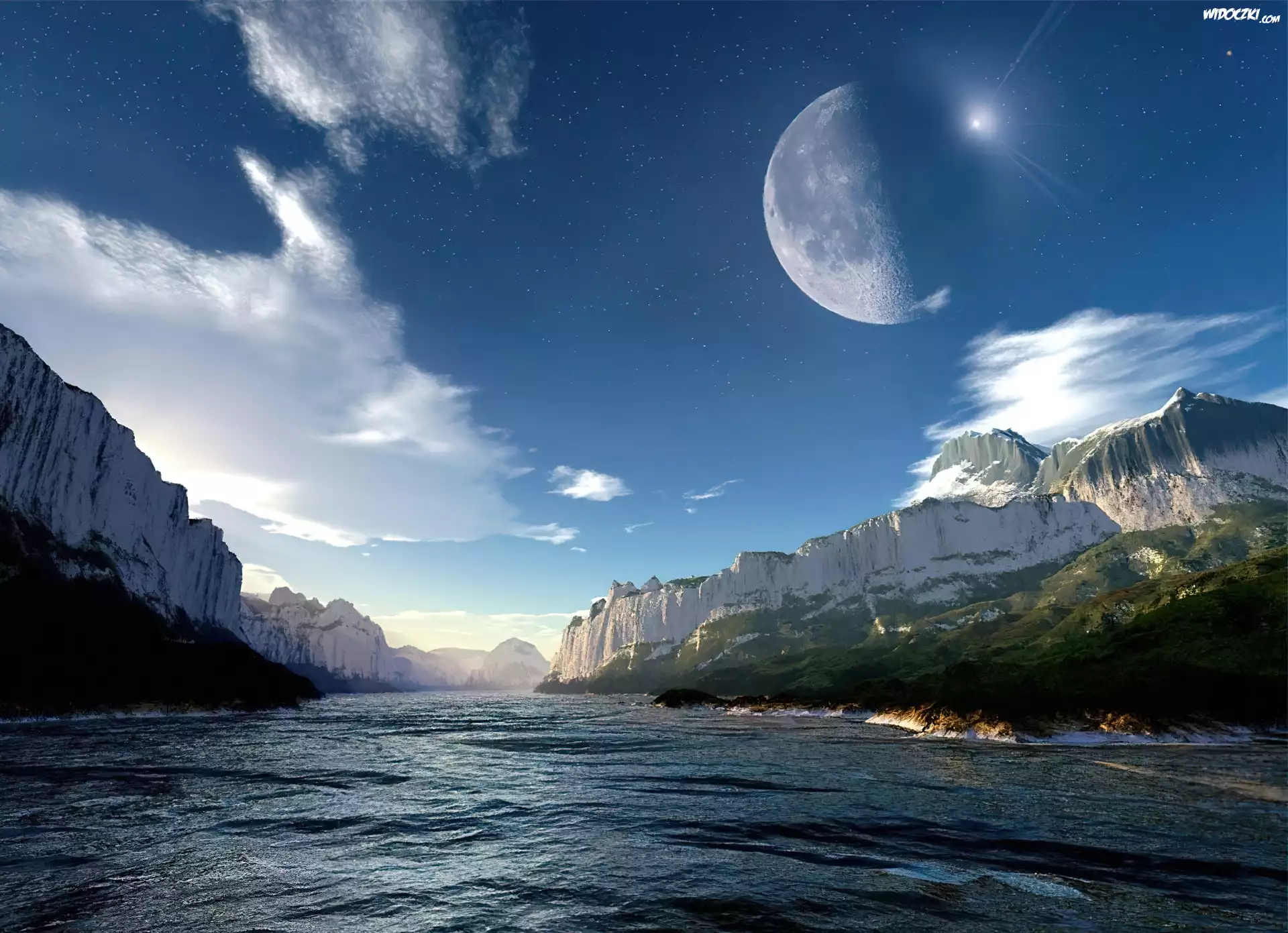 Zdjęcia, Księżyc, Skały, Rzeka, Fantasy