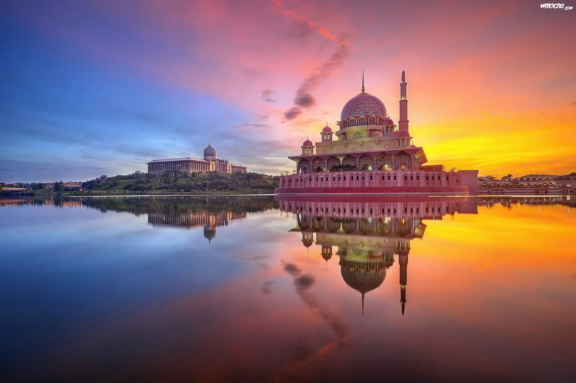Zdjęcia, Meczet, Kuala, Lumpur, Zachód, Słońca, Jezioro, Odbicie