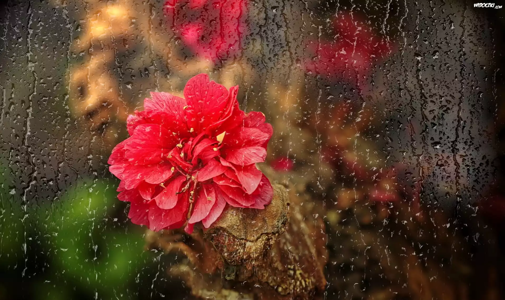 Czerwony, Kwiat, Szyba, Spływające ,Krople, Deszczu ,Odbicie