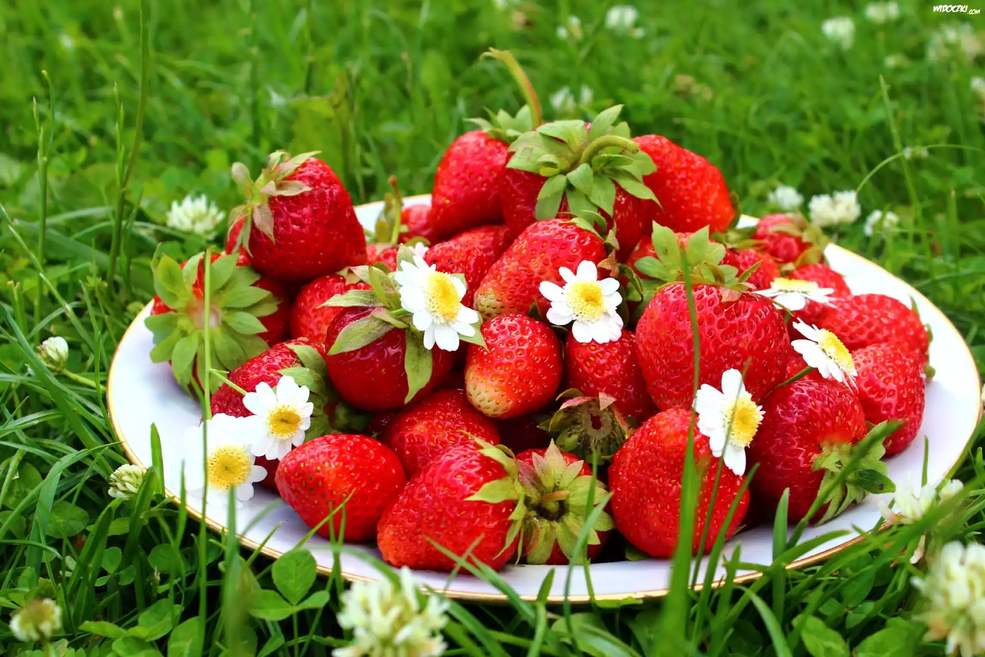 Zdjęcia, Truskawki, Kwiatki, Łąka