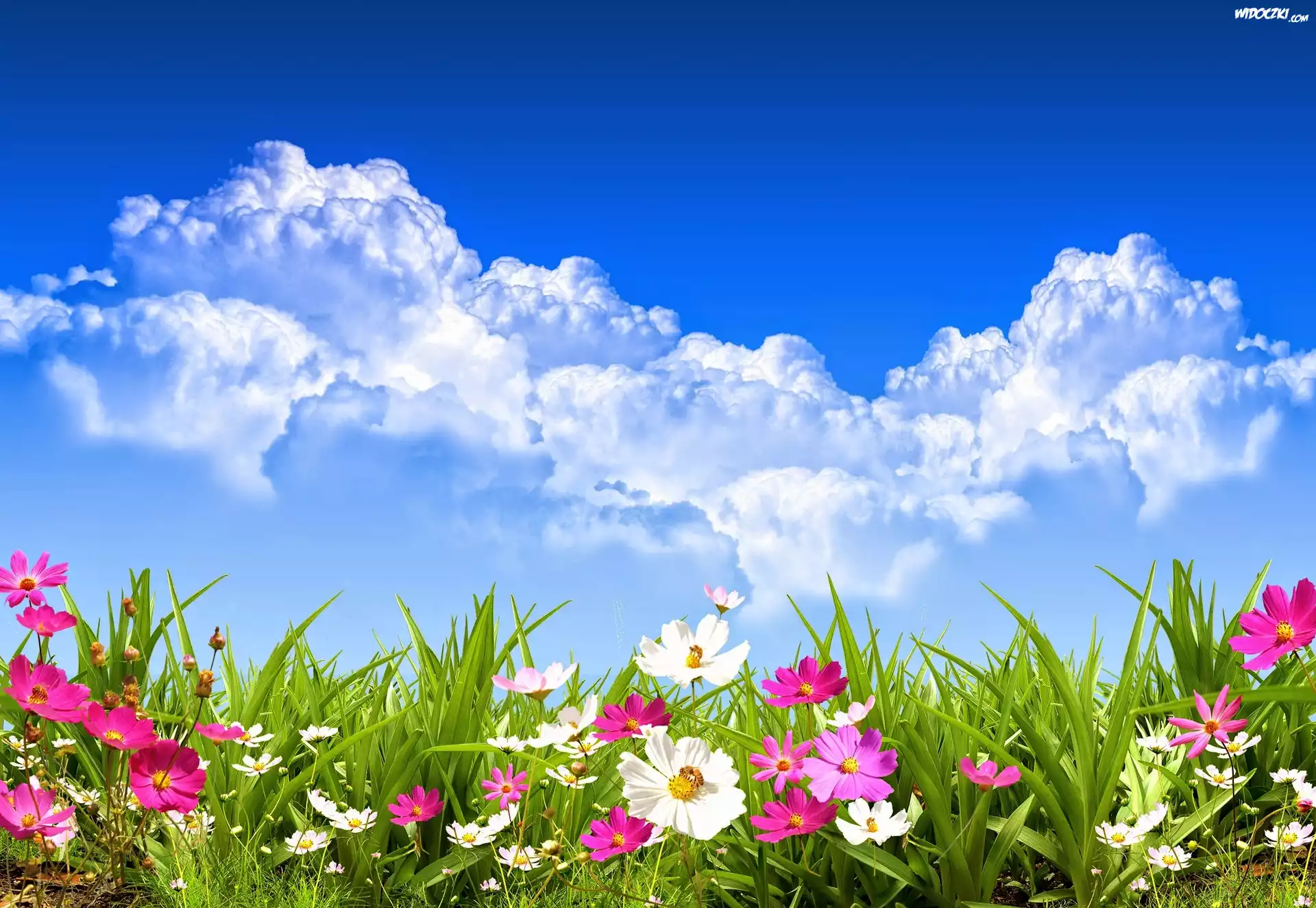 Zdjęcia, Łąka, Kwiaty, Chmury