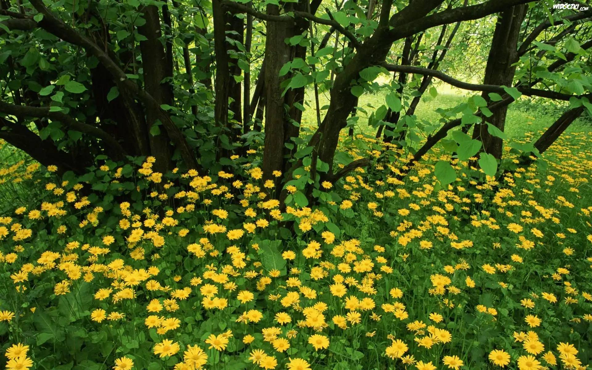 Zdjęcia, Łąka, Kwiaty, Drzewa