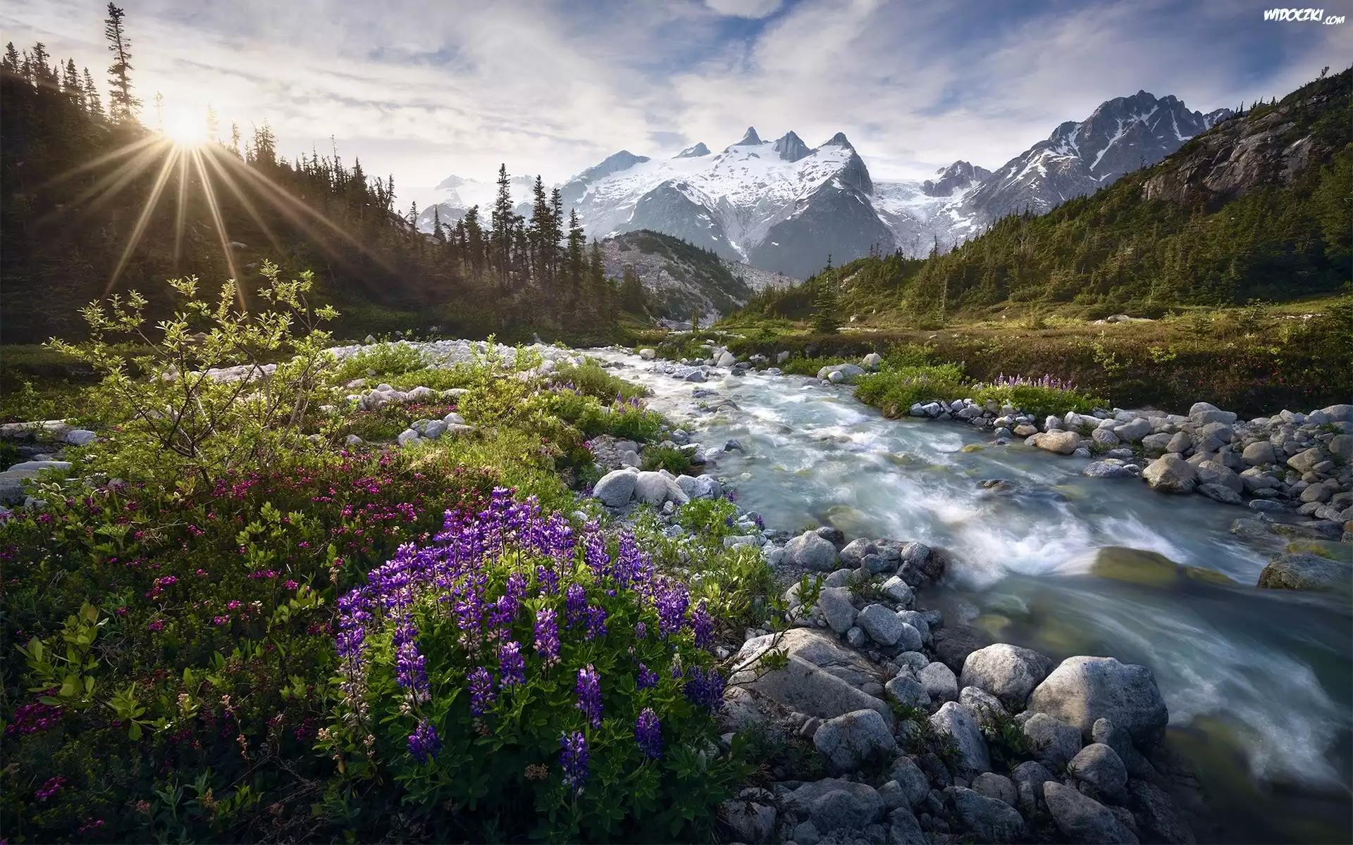 Kanada, Kolumbia Brytyjska, Region Chilcotin, Góry, Rzeka, Promienie słońca, Kwiaty, Kamienie, Rośliny |