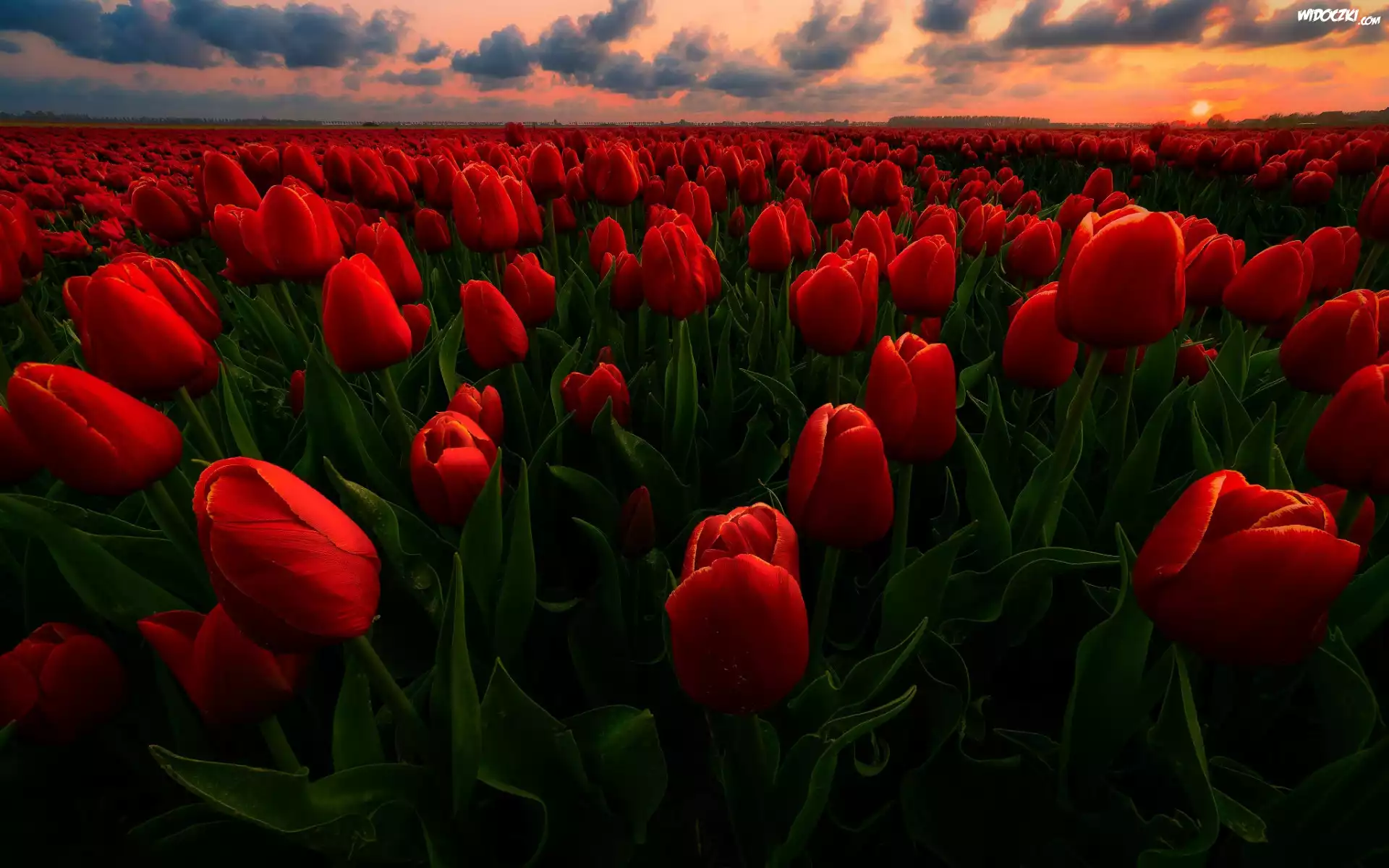 Czerwone, Kwiaty, Tulipany, Pole, Chmury, Zachód słońca