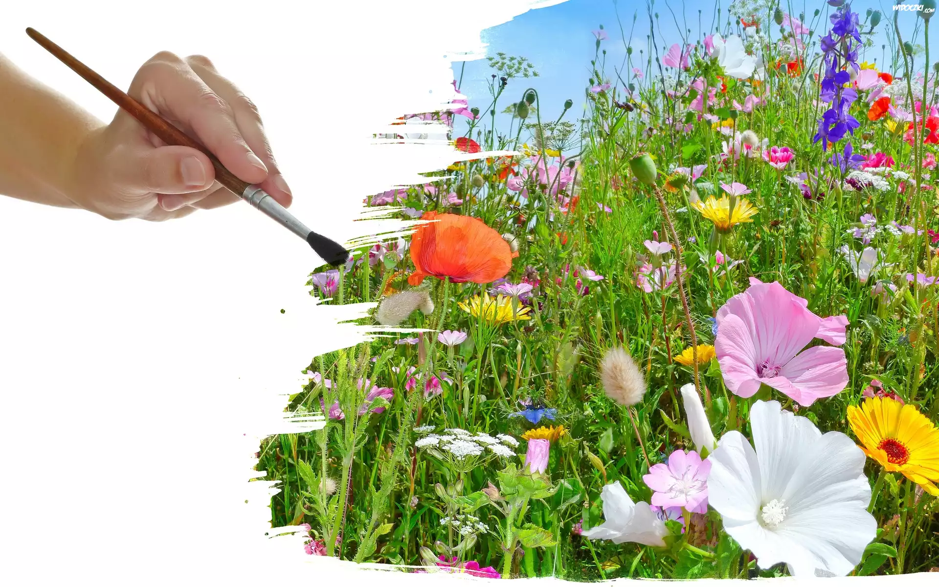 Kwiaty, Łąka, Dłoń, Pędzel, 2D