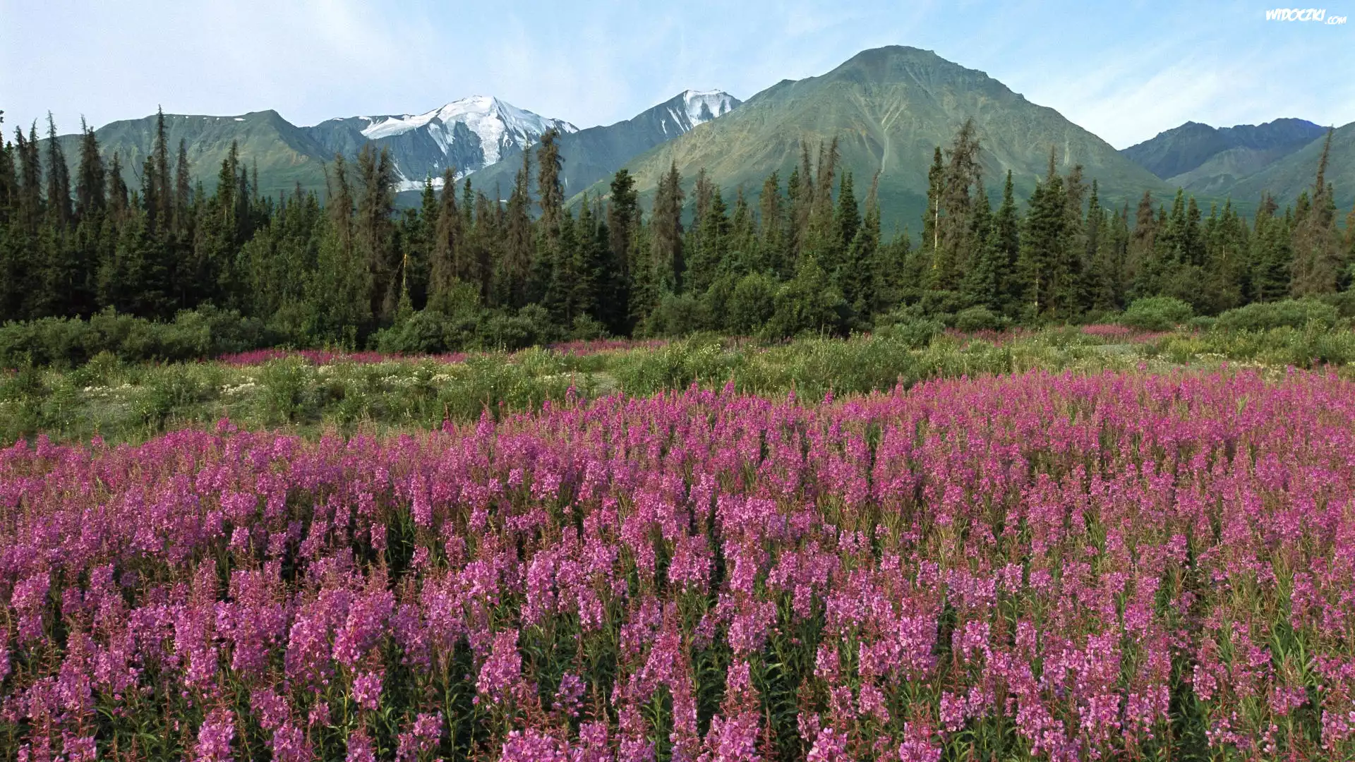 Zdjęcia, Kwiaty, Łąka, Drzewa, Góry