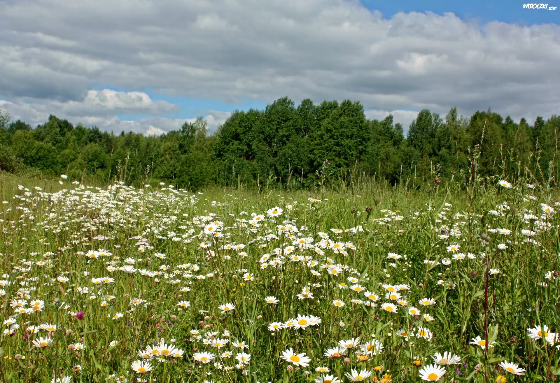 Zdjęcia, Kwiaty, Łąka, Drzewa, Niebo