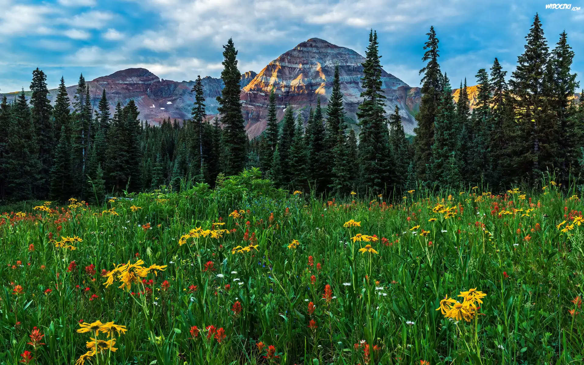 Zdjęcia, Stany Zjednoczone, Kolorado, San Juan Mountains, Hesperus Peak, Łąka, Kwiaty, Drzewa, Góry, Chmury