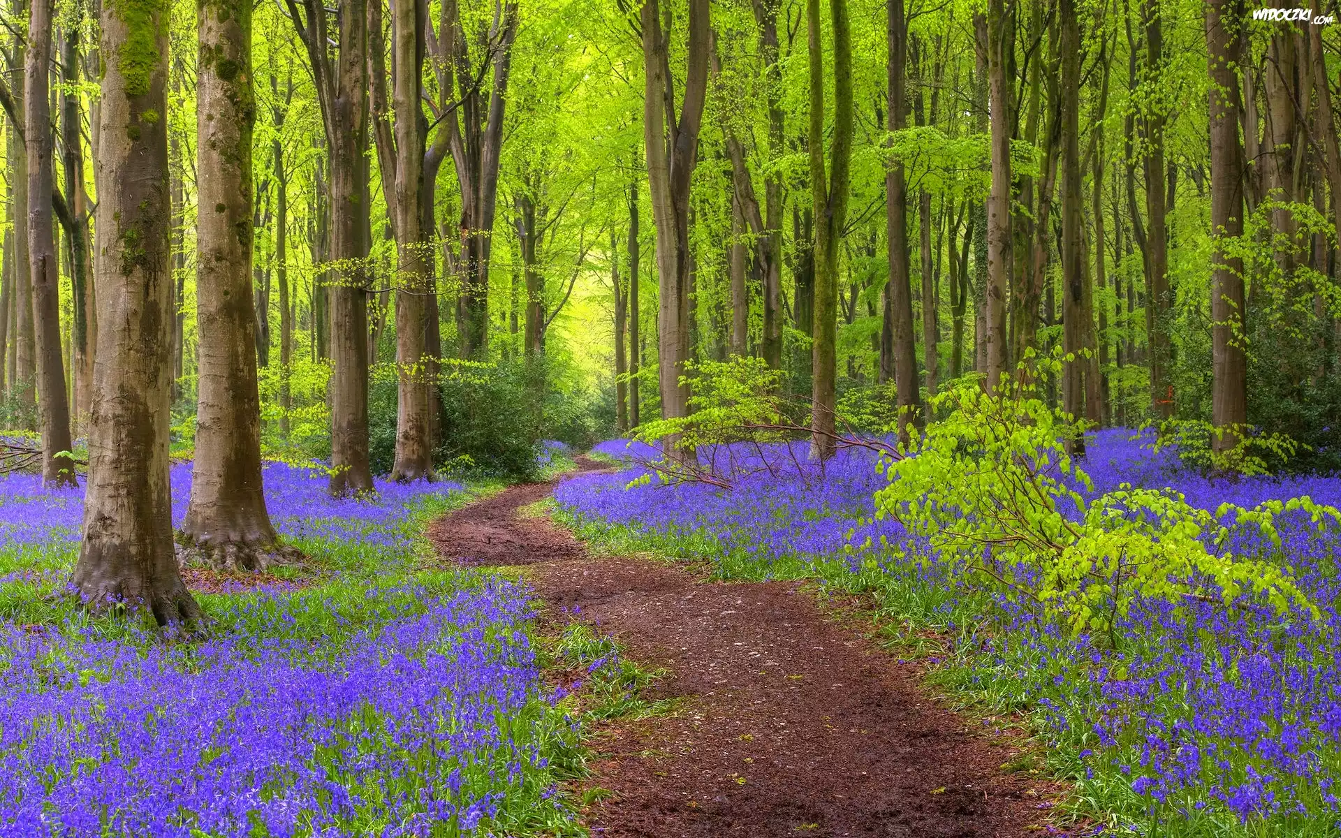 Zdjęcia, Las, Droga, Drzewa, Kwiaty, Hiacyntowce zwyczajne, Wiosna