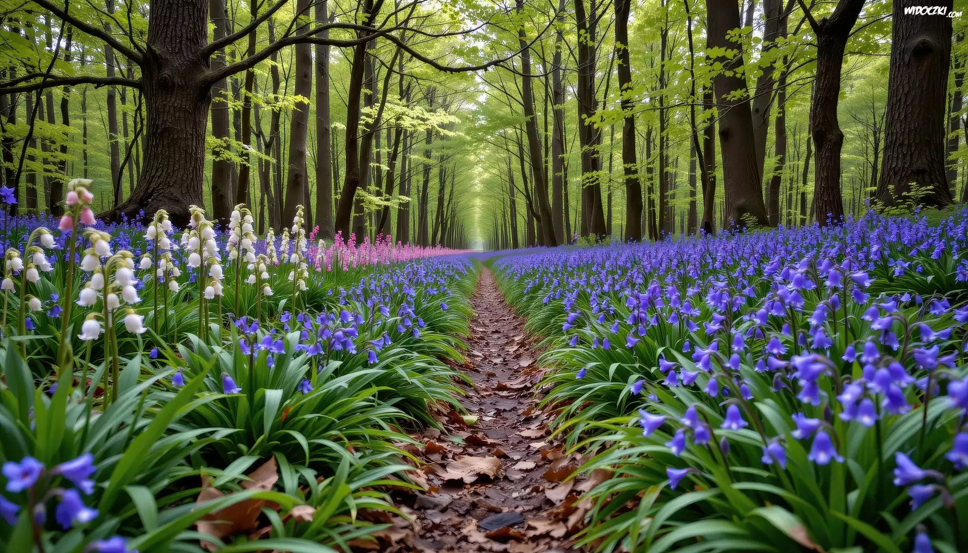 Kwiaty, Fioletowe, Białe, Różowe, Dzwonki, Ścieżka, Drzewa, Las, Wiosna