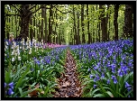 Zdjęcia, Kwiaty, Fioletowe, Białe, Różowe, Dzwonki, Ścieżka, Drzewa, Las, Wiosna