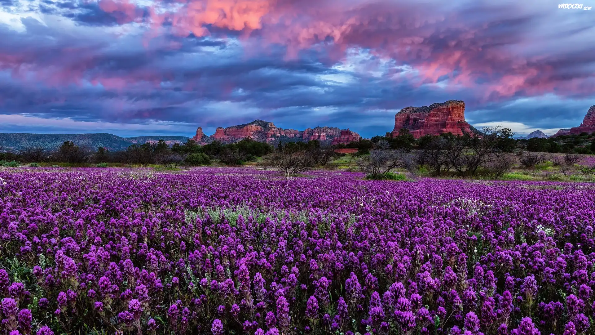 Zdjęcia, Góry, Skały, Fioletowe, Kwiaty, Drzewa, Chmury, Łąka