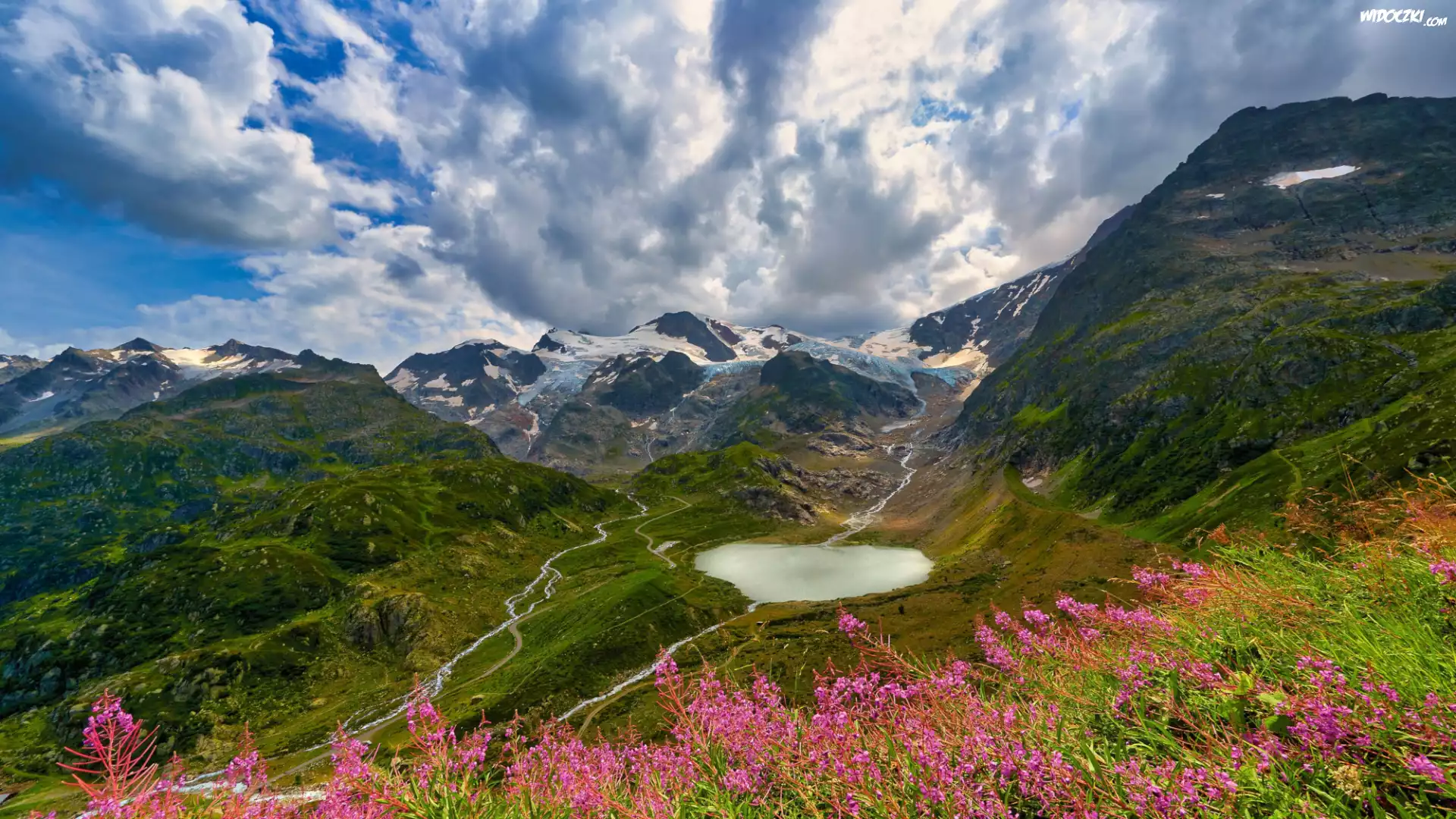Zdjęcia, Kwiaty, Dolina, Jezioro, Góry, Chmury