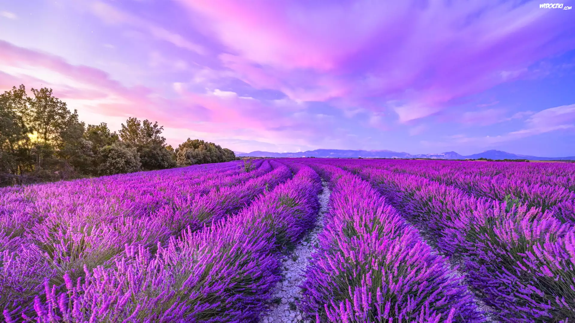Pole, Kwiaty, Lawenda, Drzewa, Niebo