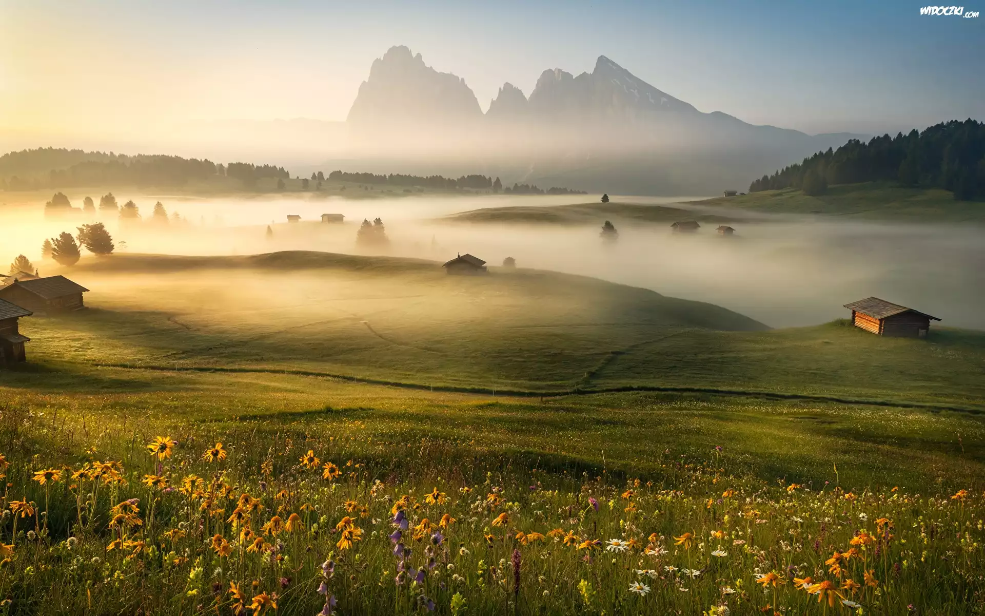 Zdjęcia, Łąka, Kwiaty, Poranna, Mgła, Płaskowyż Seiser Alm, Góry, Dolomity, Włochy