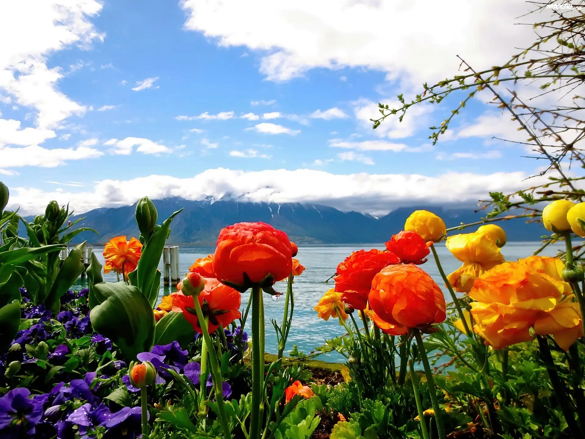 Zdjęcia, Kwiaty, Rzeka, Obłoki, Rozmycie