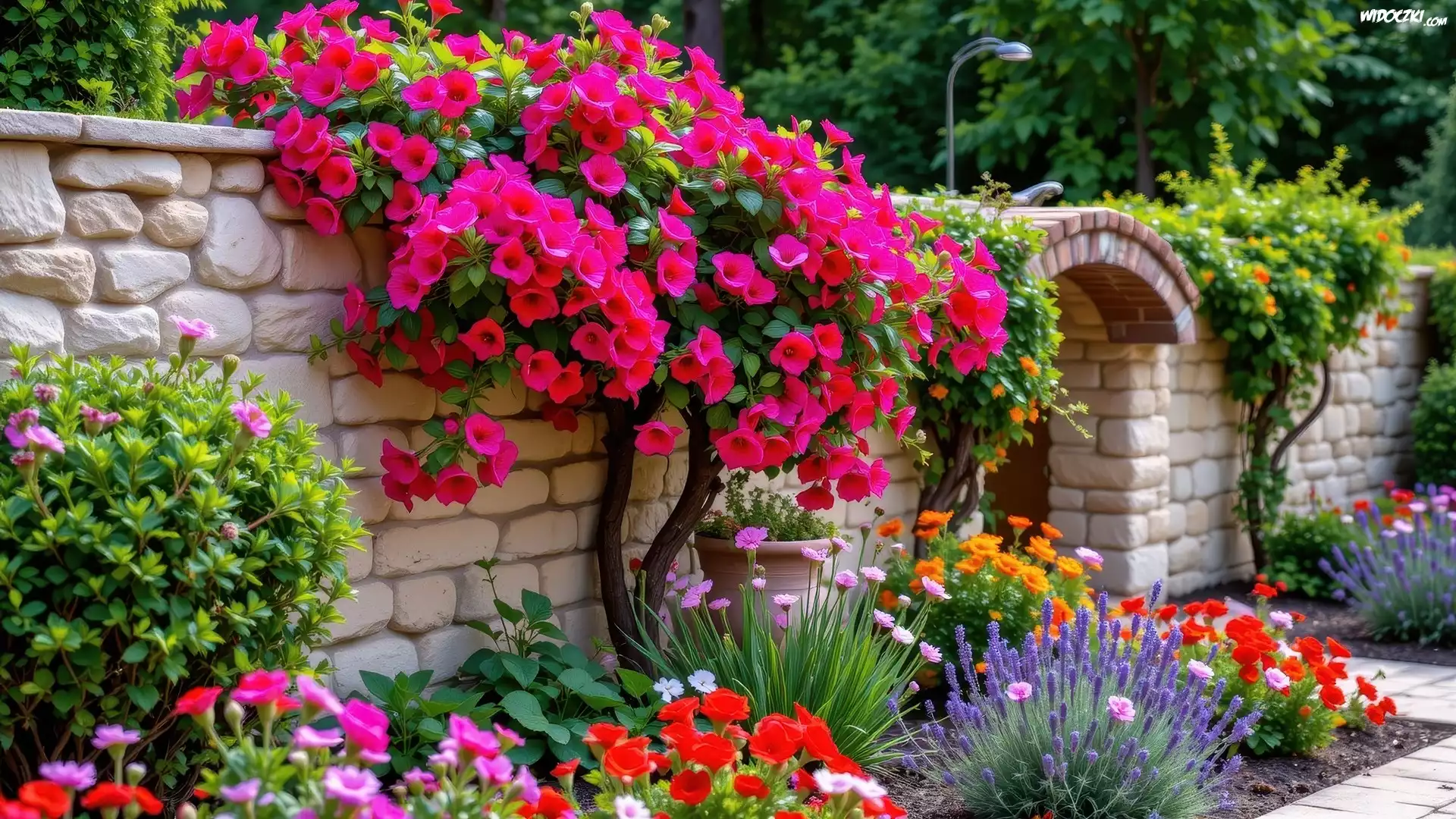 Zdjęcia, Ogród, Mur, Kolorowe, Kwiaty