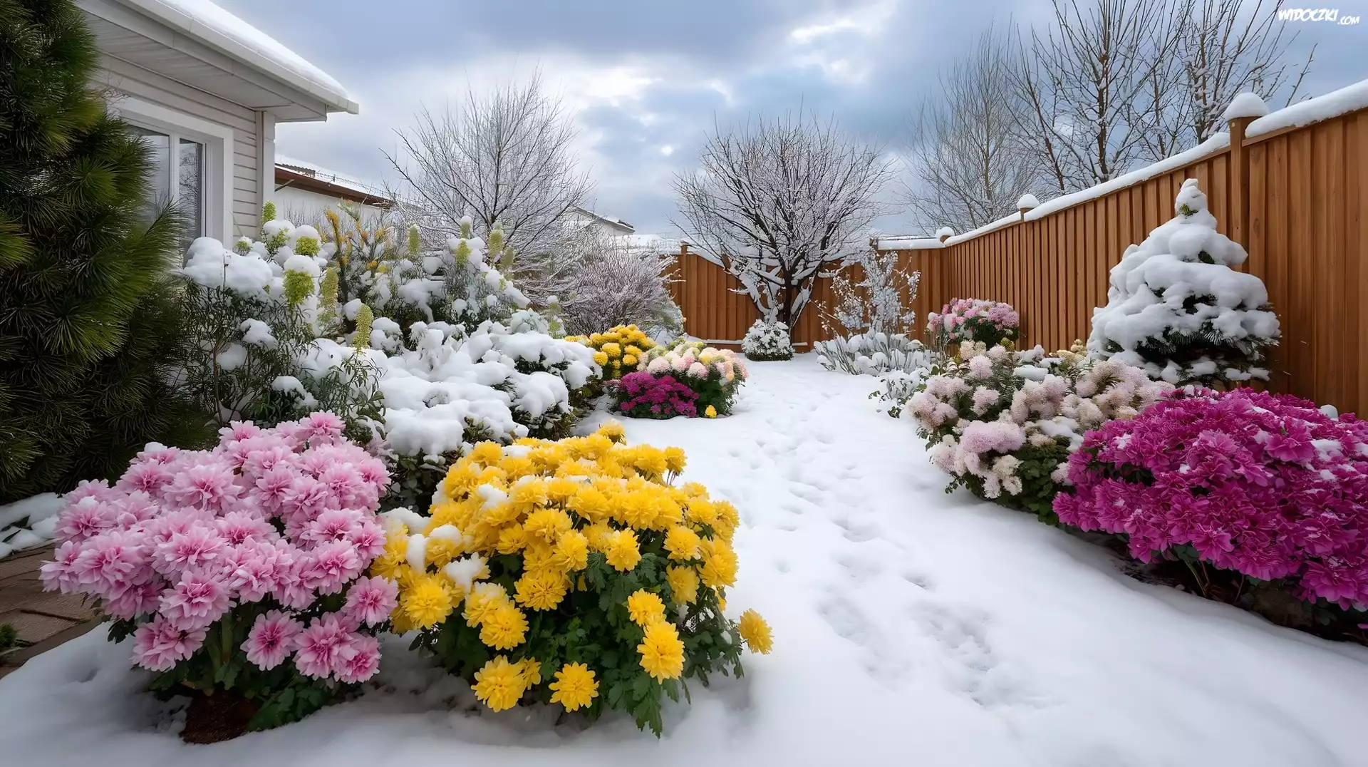Ogród, Zima, Krzewy, Kwiaty, Dom, Ogrodzenie