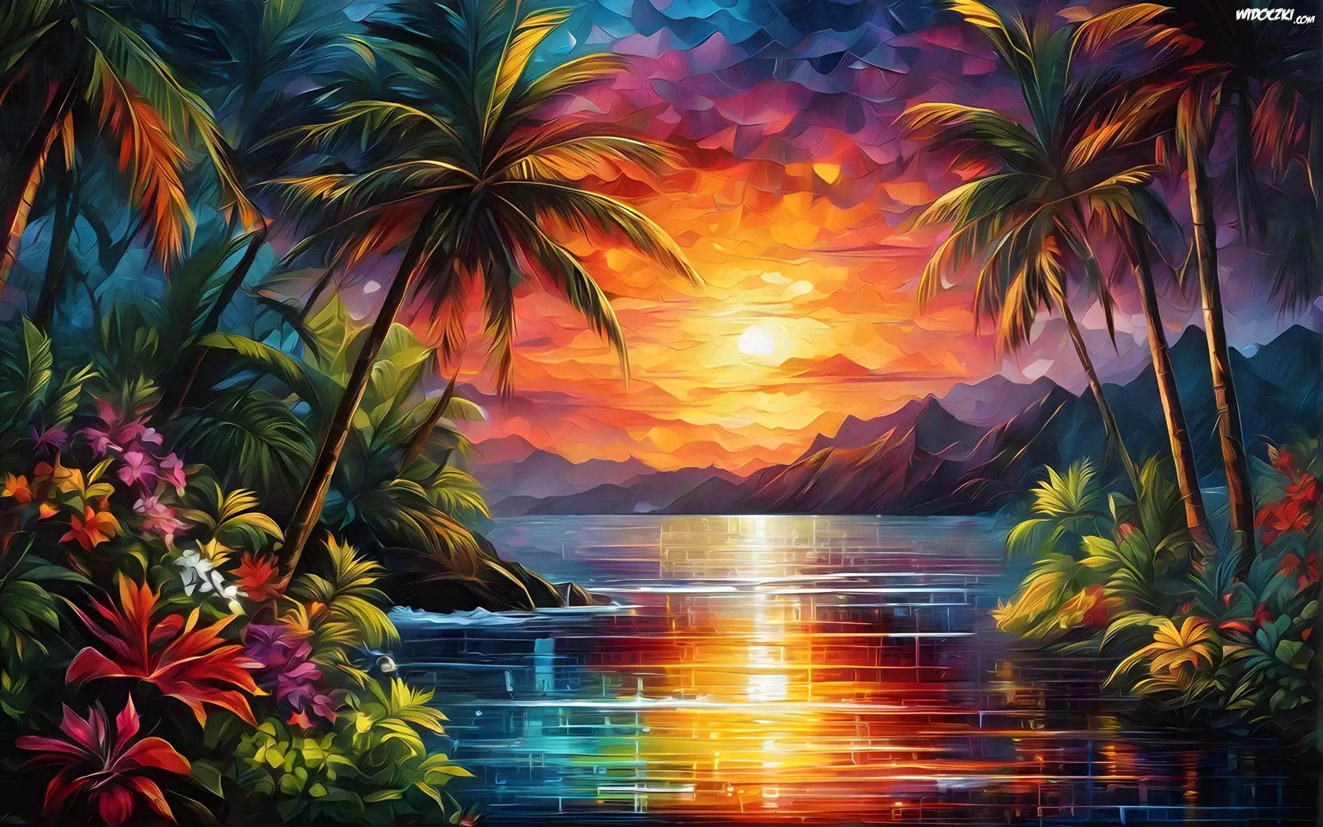 Góry, Morze, Palmy, Kwiaty, Zachód słońca, Grafika