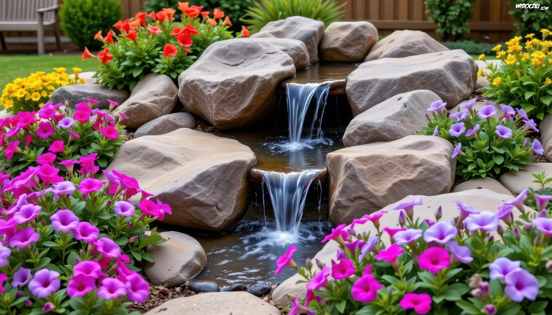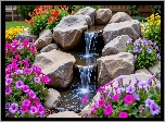 Zdjęcia, Ogród, Kwiaty, Petunie, Kaskada, Kamienie