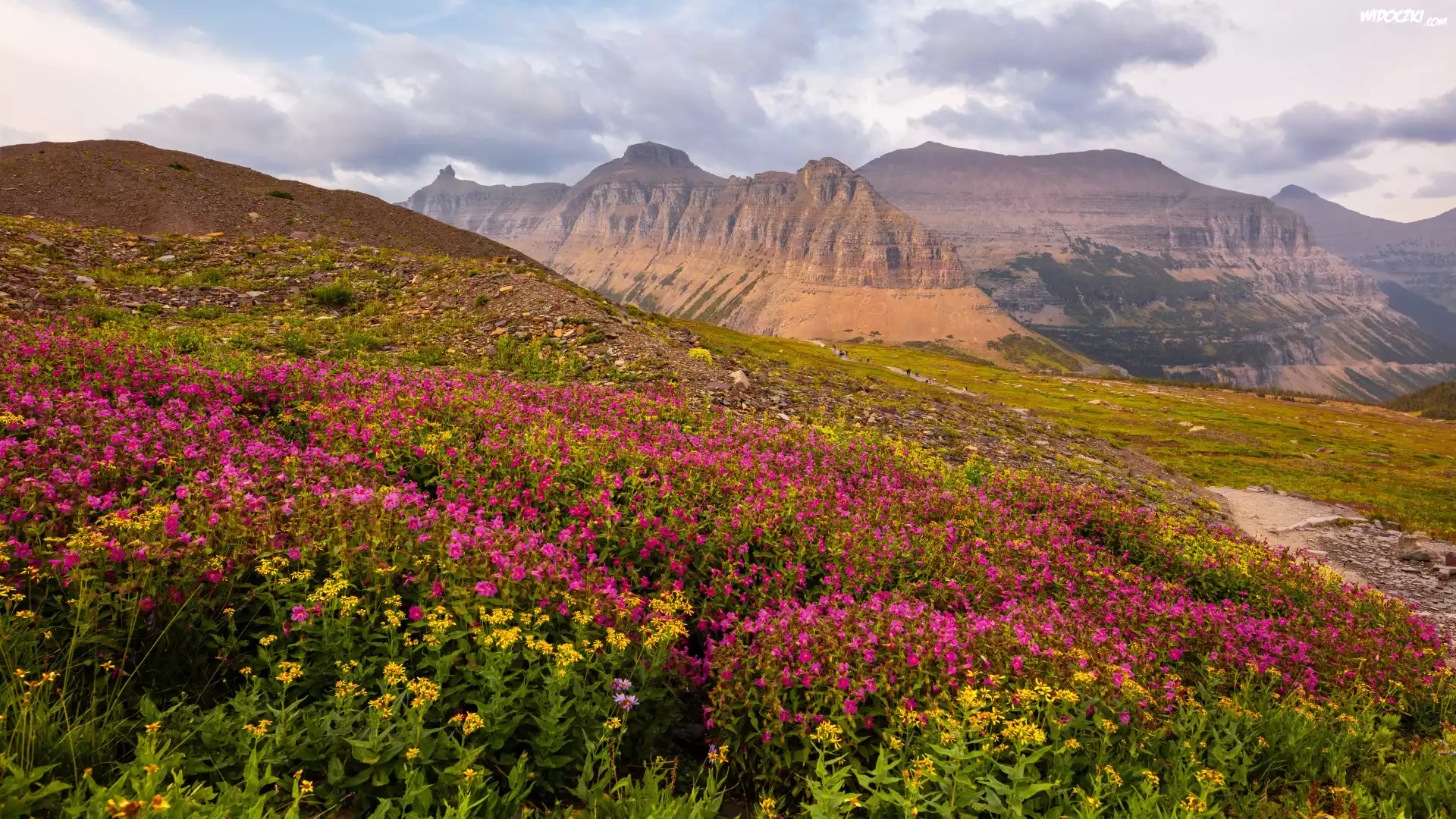 Zdjęcia, Stany Zjednoczone, Montana, Park Narodowy Glacier, Góry, Kwiaty, Polana, Łąka, Niebo