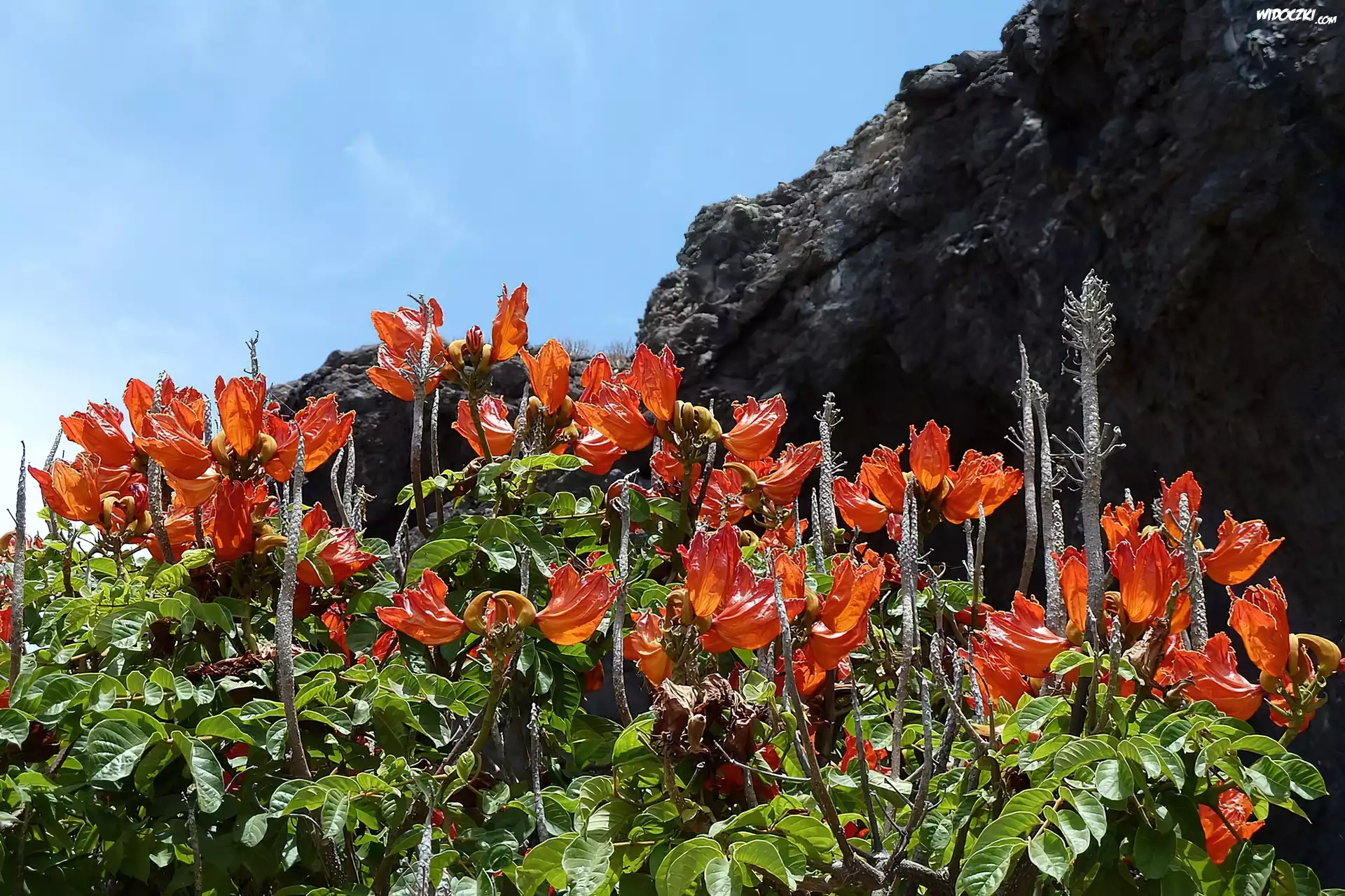 Zdjęcia, Pomarańczowe, Kwiaty, Skała