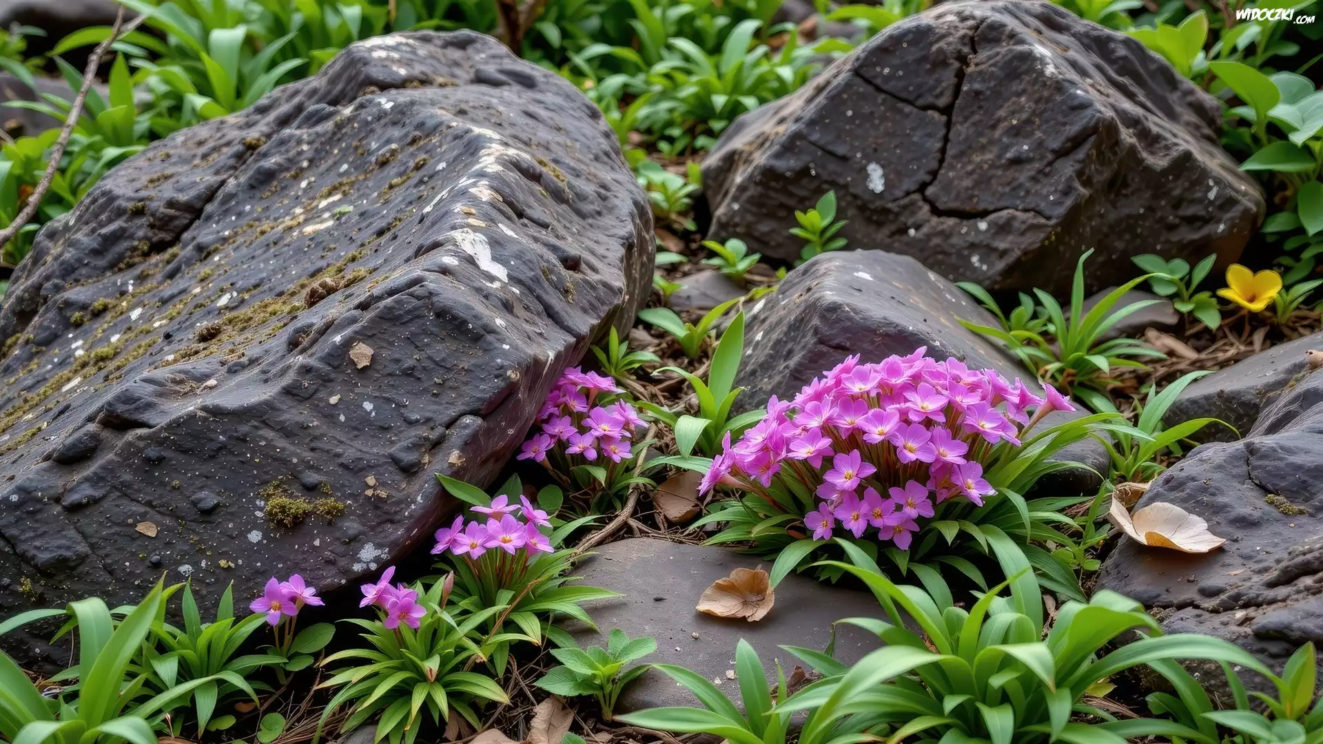 Zdjęcia, Kamienie, Głazy, Purpurowe, Kwiaty, Rośliny, Grafika AI